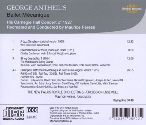 George Antheil's avant-garde signature piece, the Ballet Mécanique, generated riots in Paris at the Theatre Champs Elysees in June 1926, and the following April at New York's Carnegie Hall. Even though it was the focus of one of the most written-about events in 20th century American music history, it was not to be heard again for 62 years, until American conductor and musicologist Maurice Peress searched out the original score and restaged the 1927 concert in the very same Carnegie Hall on July 12, 1989. This world premiere recording now makes it possible to hear the original, which contained Antheil's most advanced ideas: futurist, machine-age, ragtime-inspired music of a complexity beyond human playing capabilities and a conception beyond most music composed in 1925.