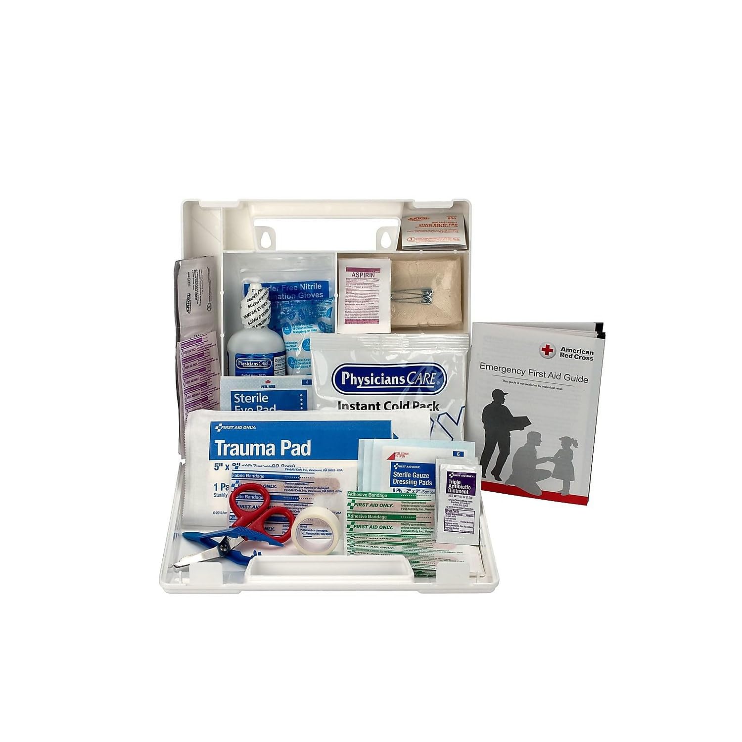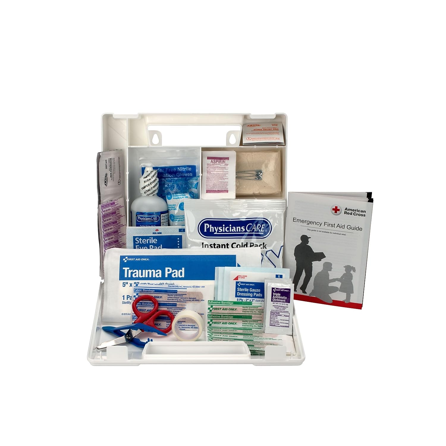 This first aid kit prepares you to tackle immediate minor injuries. Our OSHA first aid kit for offices and jobsites includes 106 emergency supplies for helping to address pain and swelling, as well as cuts, scrapes, and burns. This emergency car kit and office kit is compact, easy to carry, and includes individual compartments designed to neatly store everything. Ideal for taking on the go, our first aid kits for businesses, homes, and cars allow you to address minor cuts and scrapes just about anywhere.