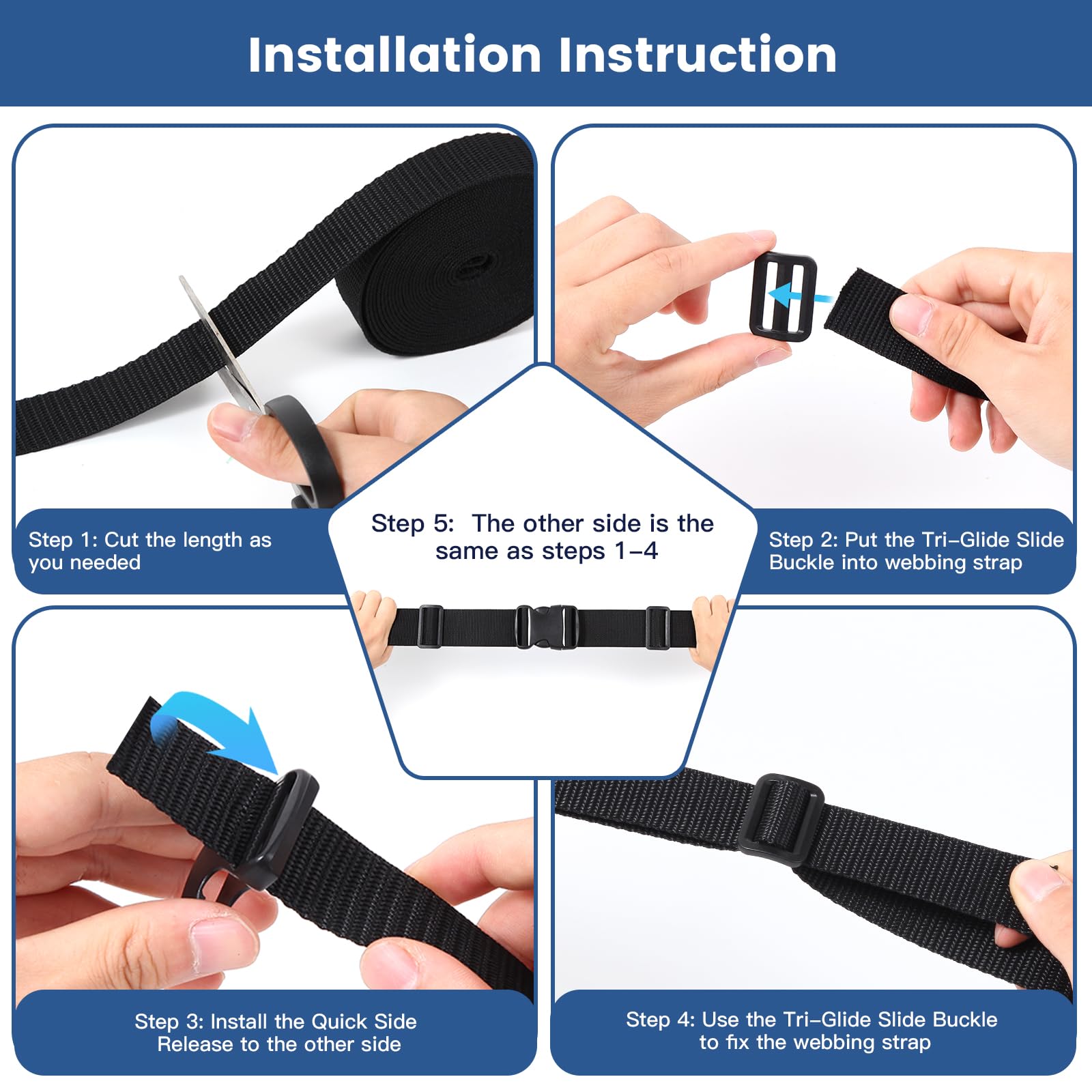 🔥2. No Sewing Required: Unlike other webbings that require sewing, the quick-release buckles do not need any stitching. Both sides of the buckle have two slots for the webbing to pass through. Simply adjust the webbing on both sides to securely fasten it in place. It is easy to use and convenient for everyday life.