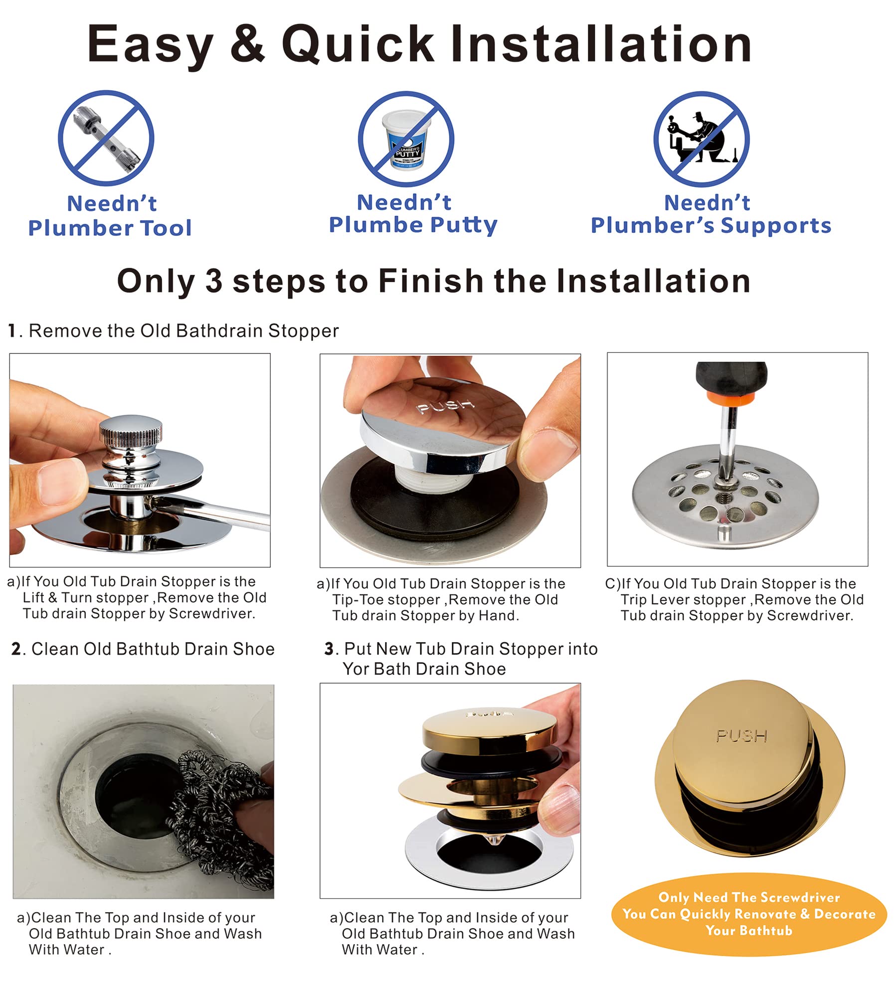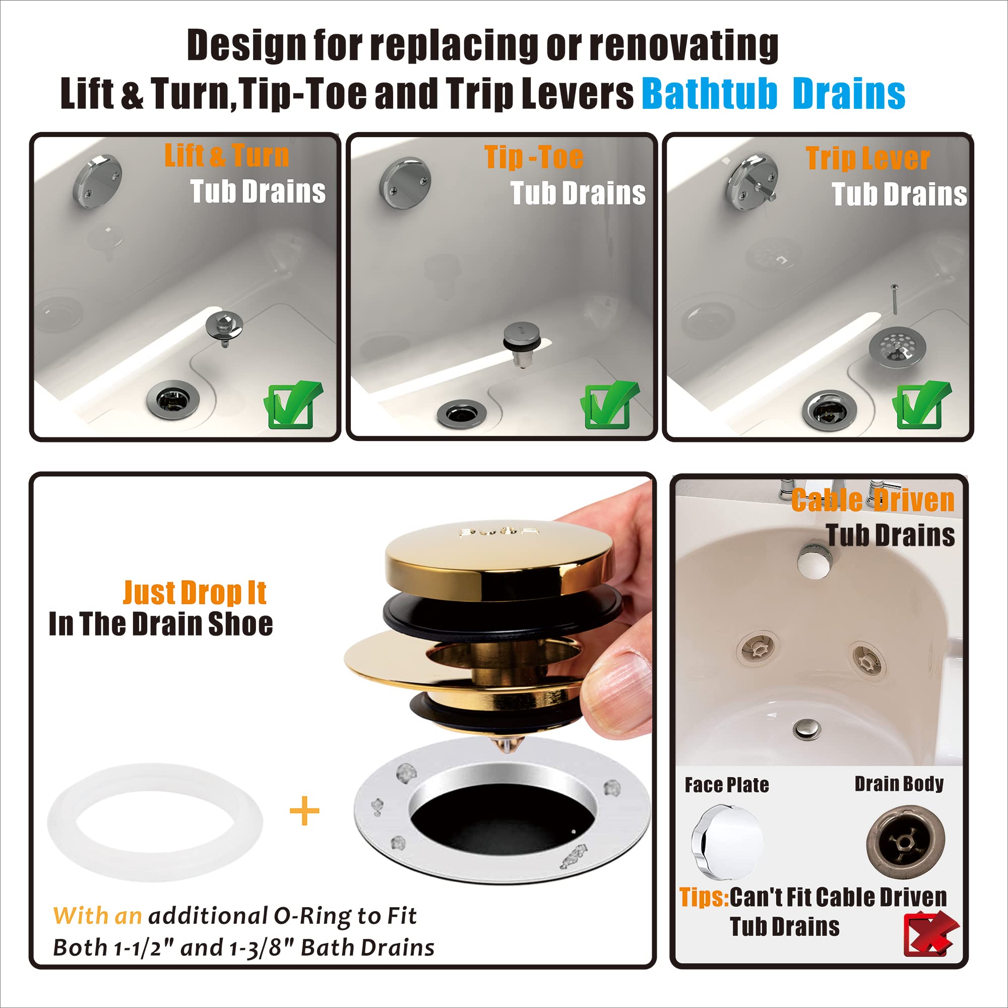 COMPATIBILITY: Artiwell Universal Tough-Toe Bath Drain Stopper and Cover have been tested by the plumber, which can be replaced 99% lift and turn, Tip Toe and trip lever Bathtub drains, Includes 2 types of o-rings for you to choose from to fit your existing 1-3/8” or 1-1/2” tub drains.
