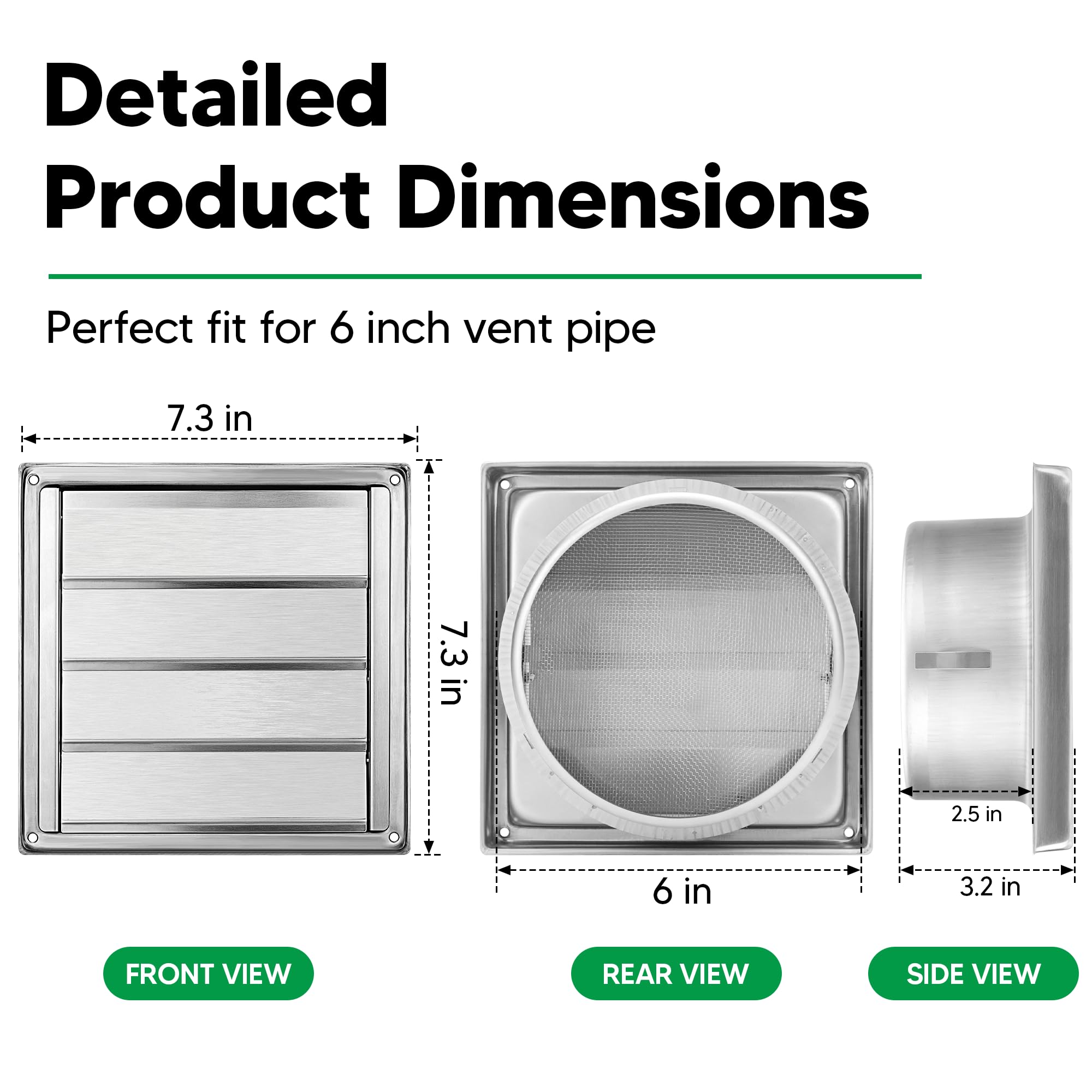 PRODUCT SPECIFICATIONS: Package includes 1 x 6" diameterstainless steel louvered outdoor dryer vent cover and 4 x installation screw. SIZE --- L: 7.1" x W: 7.1" (Note:To facilitate insertion of the vent cover into the exhaust duct, its port size will be slightly less than 6''. Please confirm the size of your exhaust equipment before purchasing)