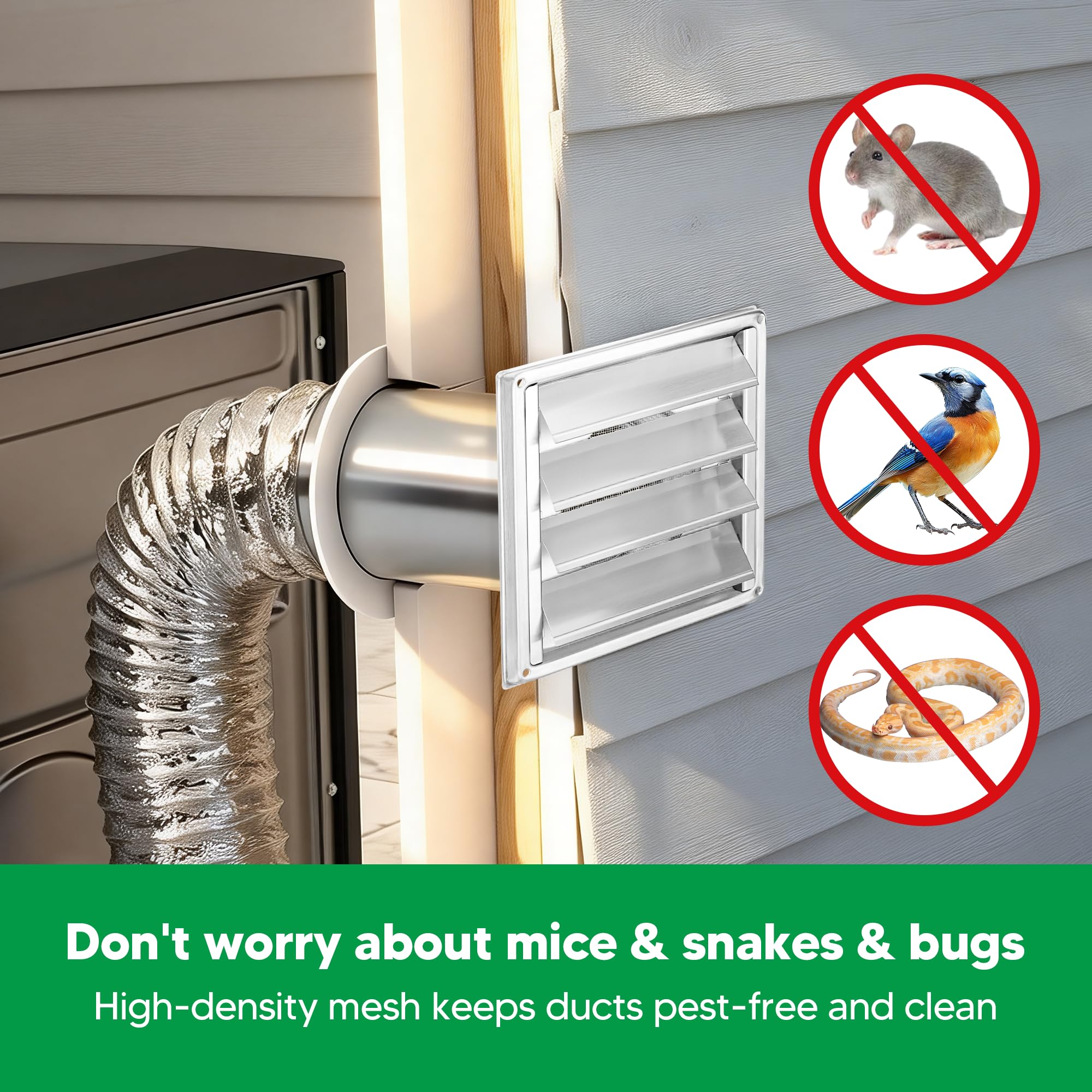 PREMIUM QUALITY: Our exterior wall vent hood is made of 304 stainless steel material well-tested by the manufacturer, and provides anti-rust and anti-corrosion in any weather conditions to protect your dryer from annoying rodents like mice, rats, birds, snake and squirrels. If the lint is too much to cause accumulation, the fine net can be disassembled and used