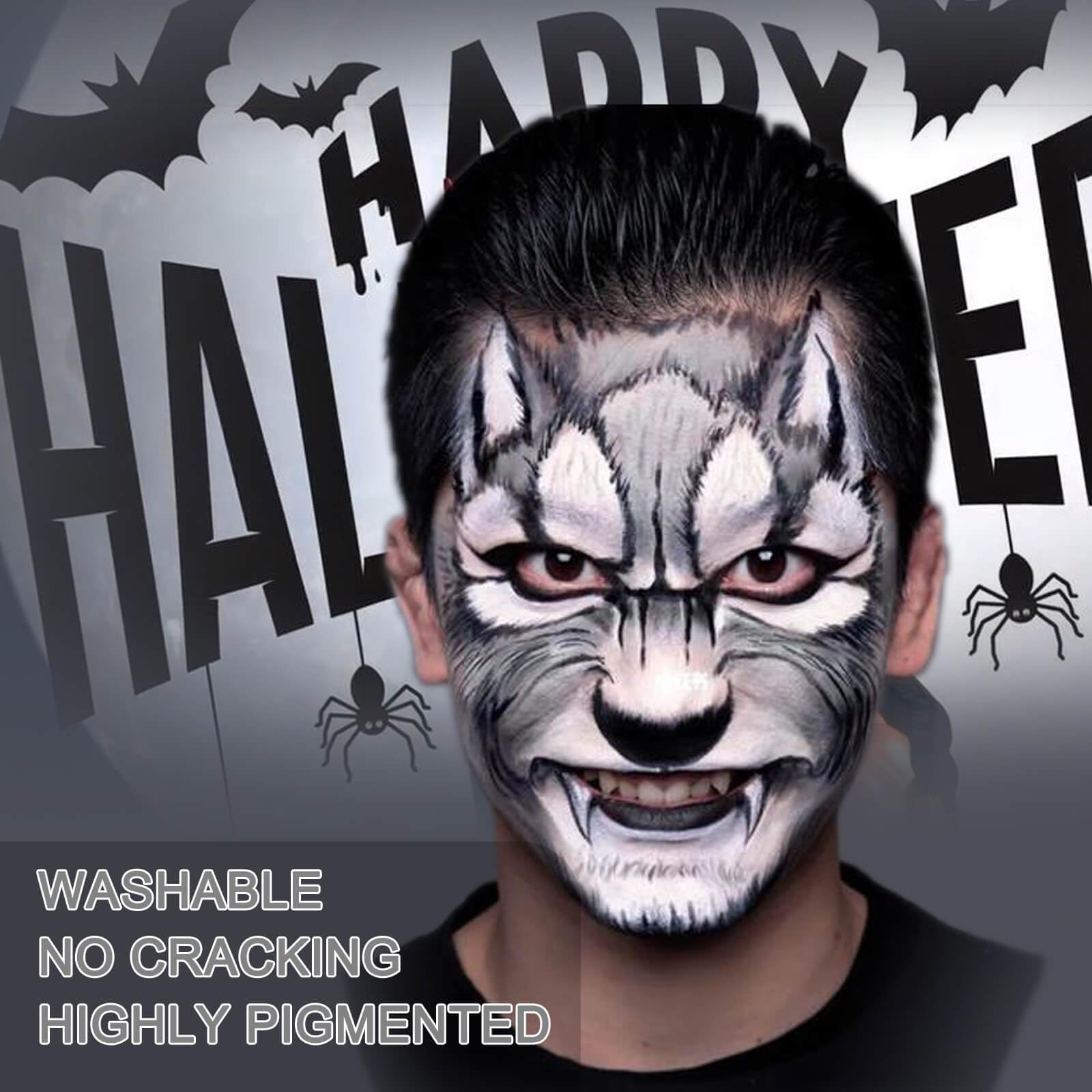 βProfessional Halloween Face Paint with Large Capacity --- 2.37Oz/70g for our face paint,meet your need for full coverage.The nice consistency makes it blend well into the skin easily with a brush, sponge, or your finger.It may need some time to dry.To avoid smearing when put on,we advise use the setting powder or setting spray after applying the face body paint