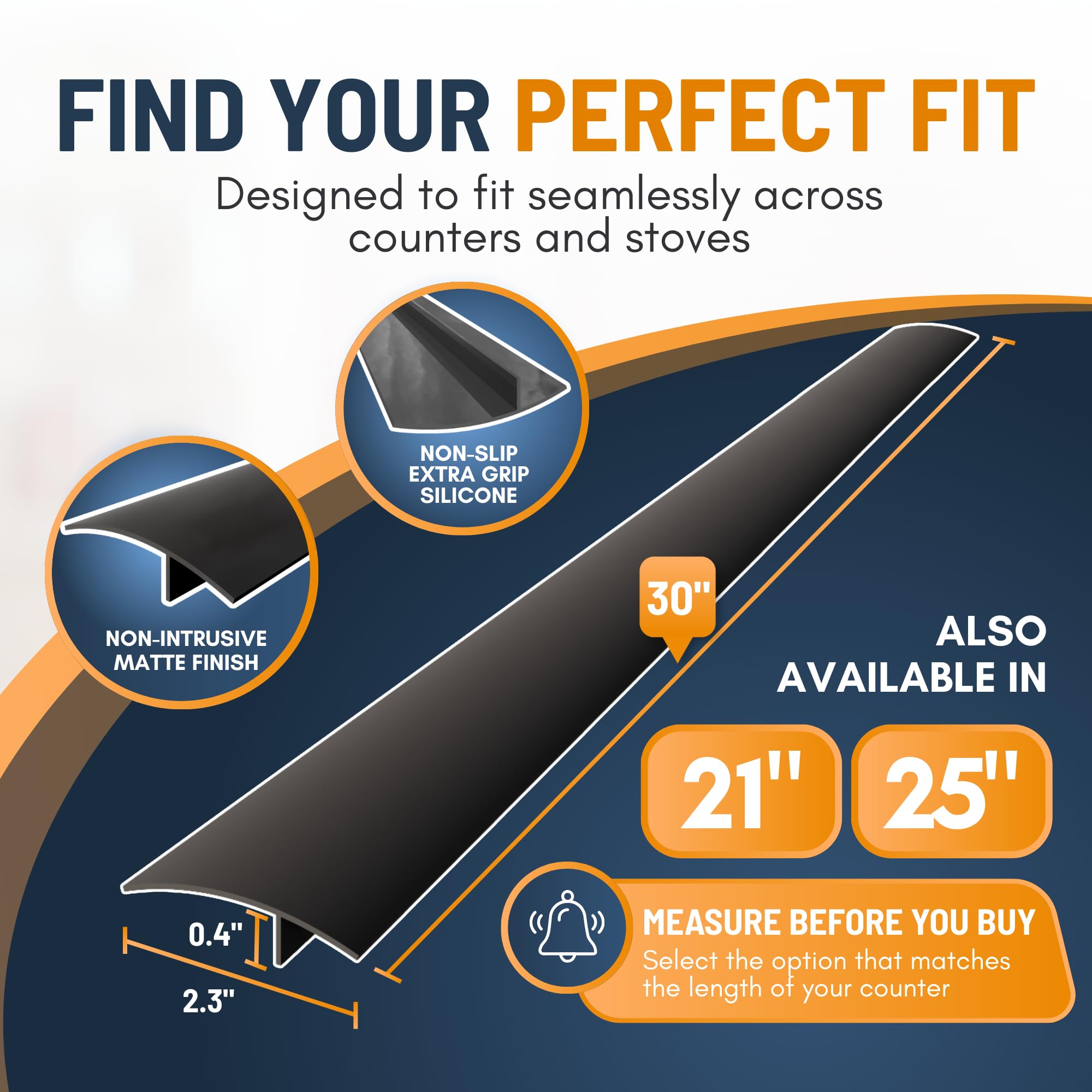 SIMPLE TO INSTALL: Our universal 30 inch stove gap guard sit perfectly in place on all stovetops. The non-slip flexible silicone conforms to your stove and counter surfaces and adapts to any uneven spaces. Easily customize to your stove by cutting to size using scissors