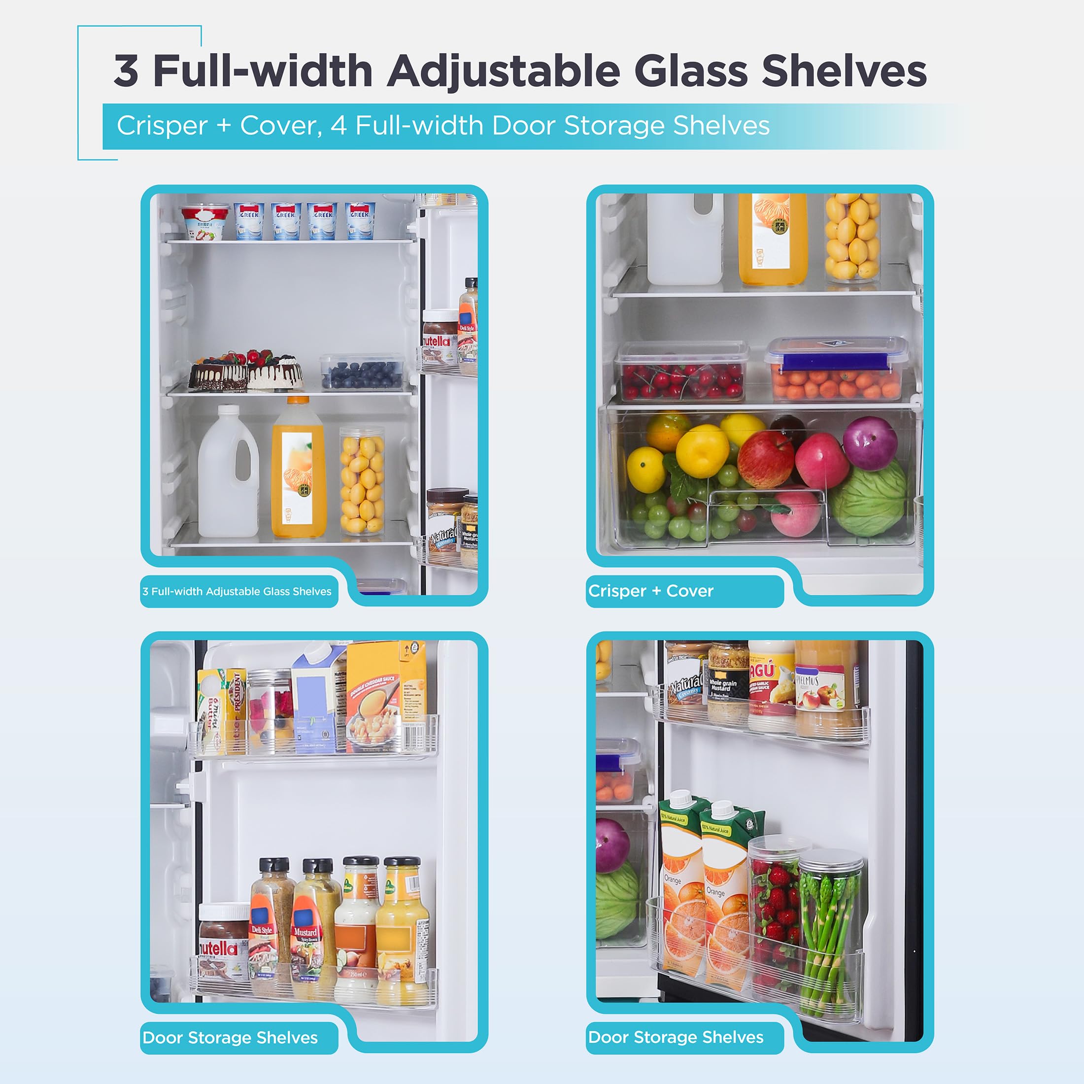 Interior Storage Options: Our apartment size refrigerator comes with 3 adjustable, removable glass shelves for optimized storage, as well as 4 full-width bins on the fridge door
