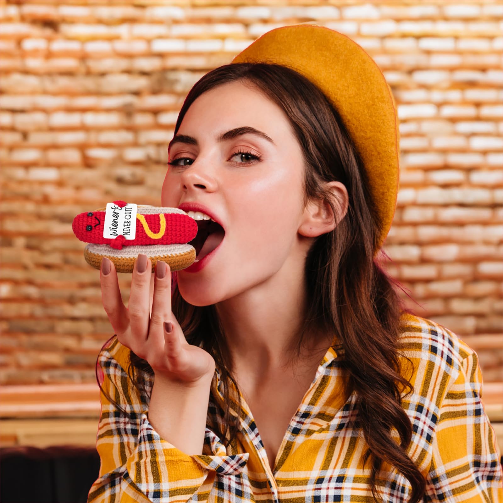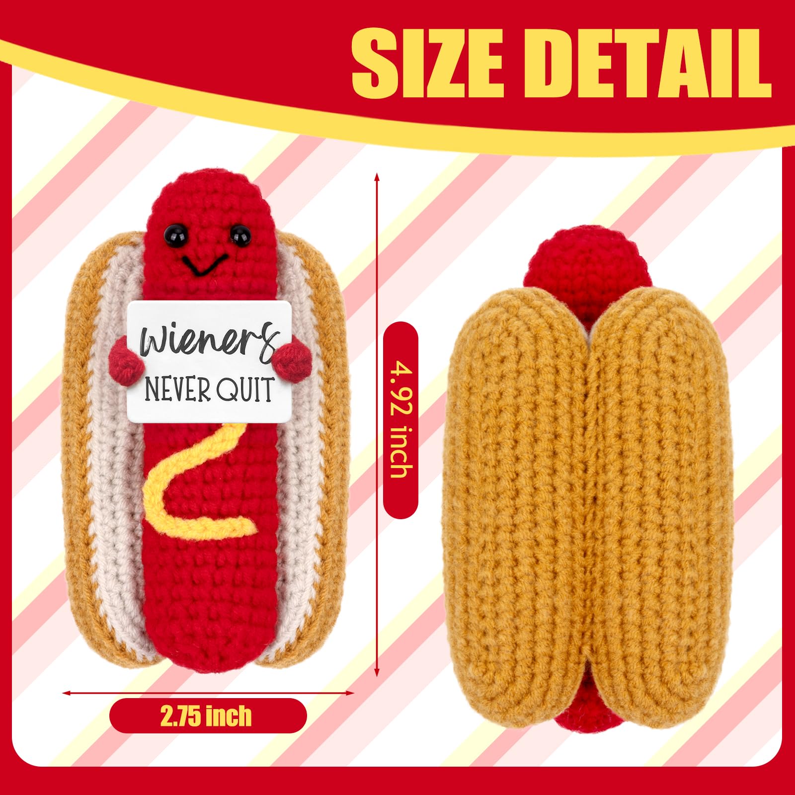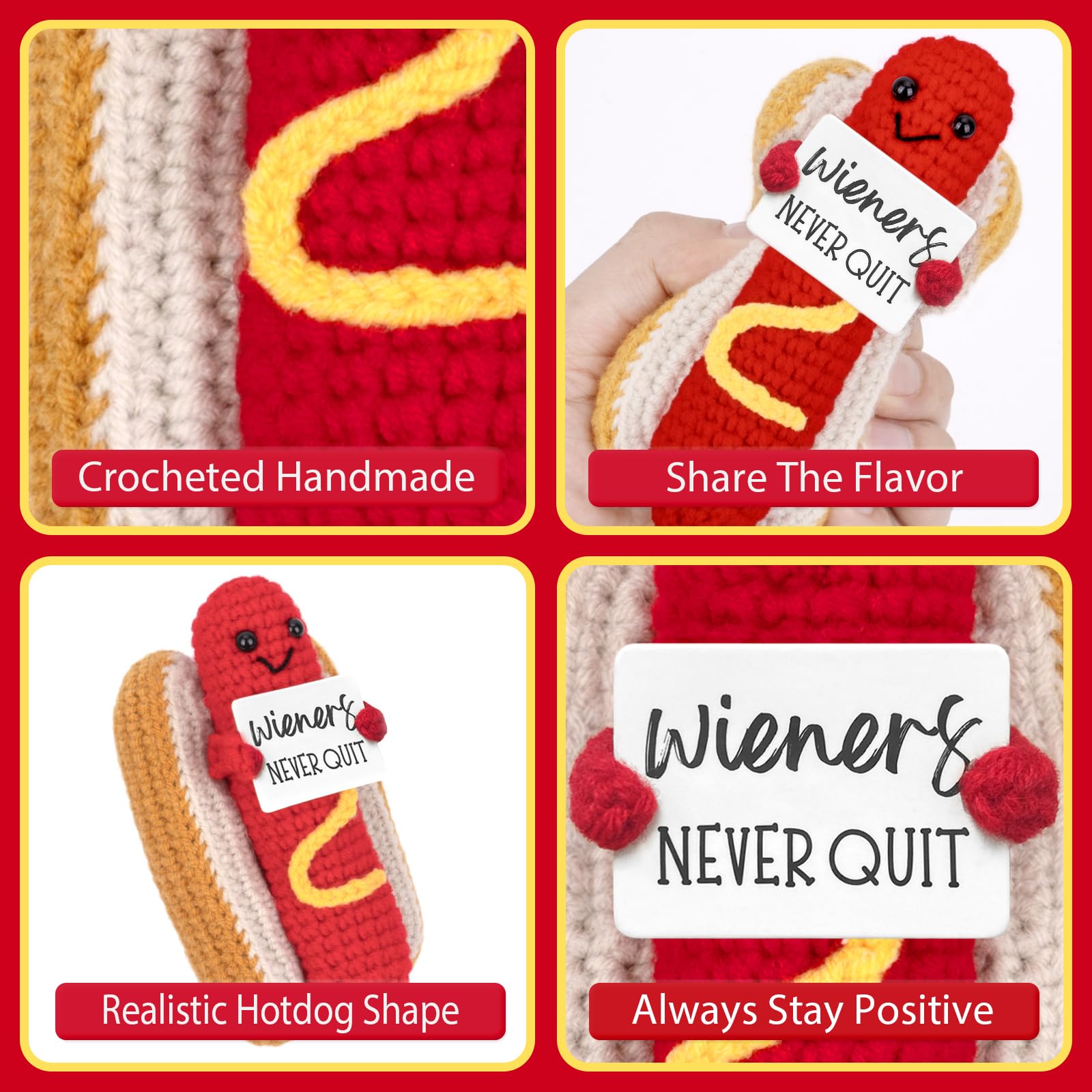 Handmade & Good quality: This little crocheted hot dog is absolutley adorable!!! Great little positive reminder that you important. Very well made, stitching is flawless and shape is perfect. Cute little size for display. When pinch it, you will feel so soft to the touch but not floppy