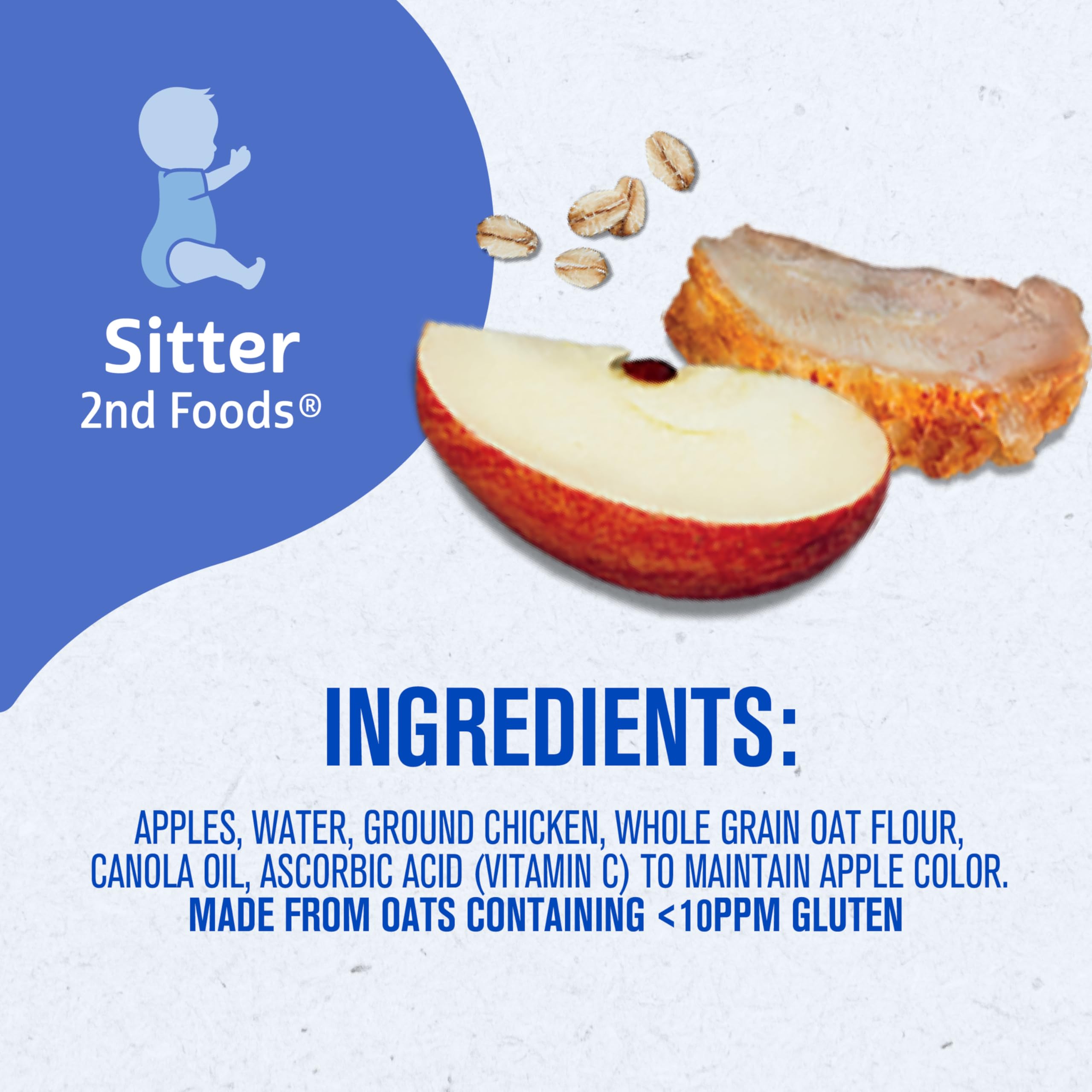 Our Gerber 2nd Foods Dinner baby foods help expose babies to a variety of tastes and ingredient combinations which is important to help them accept new flavors. This 2nd Foods Apple Chicken Dinner recipe is made with the goodness of 1/4 cup apple, 1 1/2 tsp chicken, and 2 tbsp cooked rice in each tub.