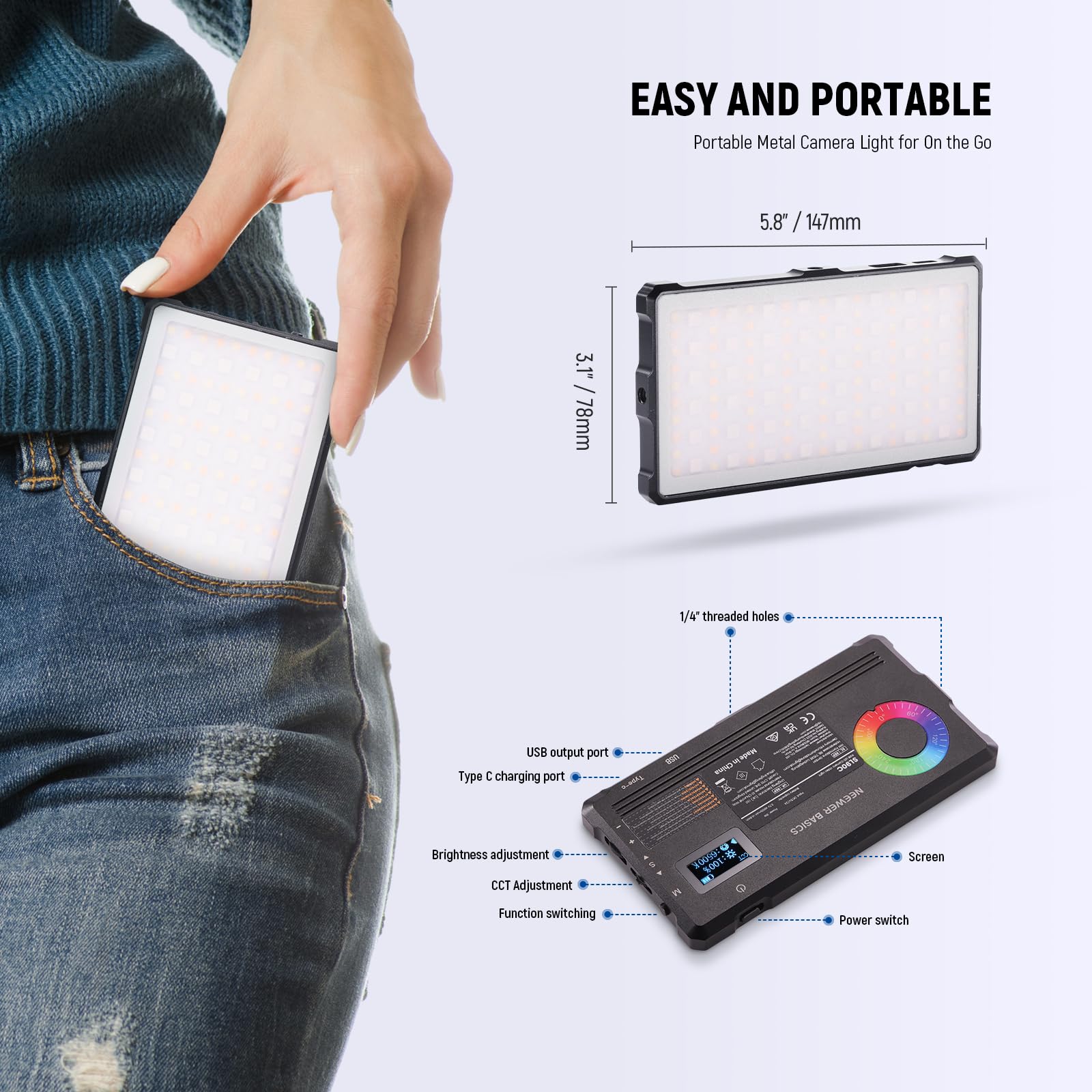 【Portable Metal Camera Light for On the Go】 Made of lightweight yet robust aluminum alloy, the SL90C is a portable LED RGB camera selfie soft continuous light designed for flexible use in a wide range of photography and videography lighting scenarios. Measuring just 5.9"x3.1"x0.5"/15x8x1.2cm and weighing only 8.3oz/235g, it easily slips into your pocket for effortless transport