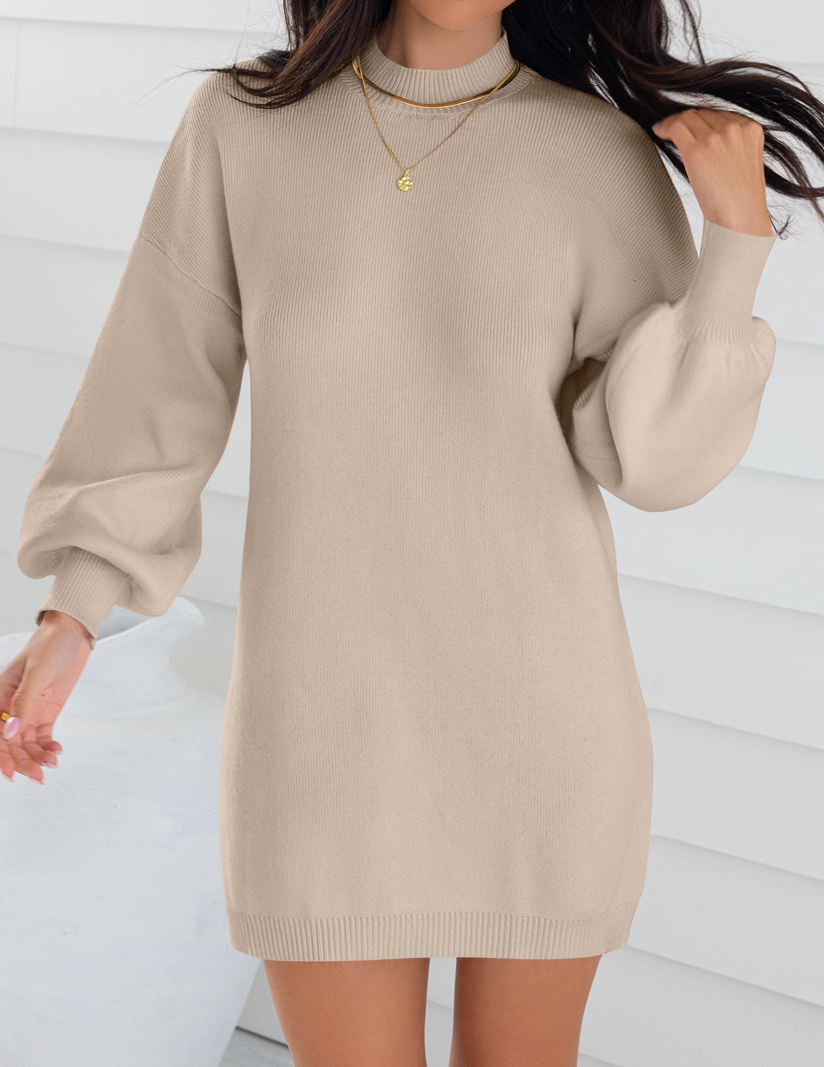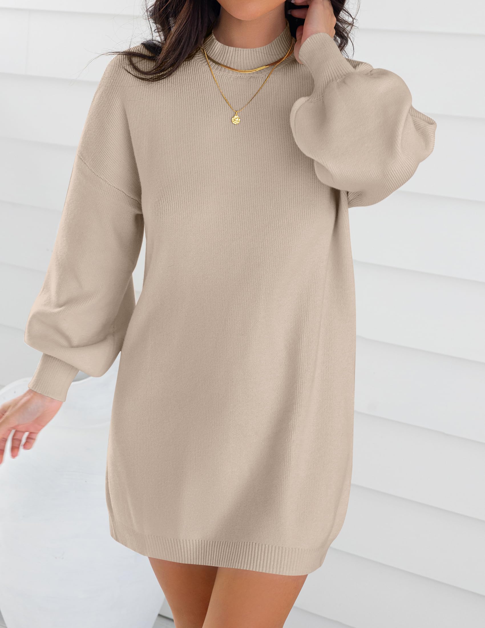 Sweater dresses for women 2025, mini dresses for women, fall sweater dress, lantern long sleeve dress, ribbed knit dress, mock neck, loose fit, classic solid color, above knee length, slouchy and baggy style, maternity dress, winter dress, cocktail party dress