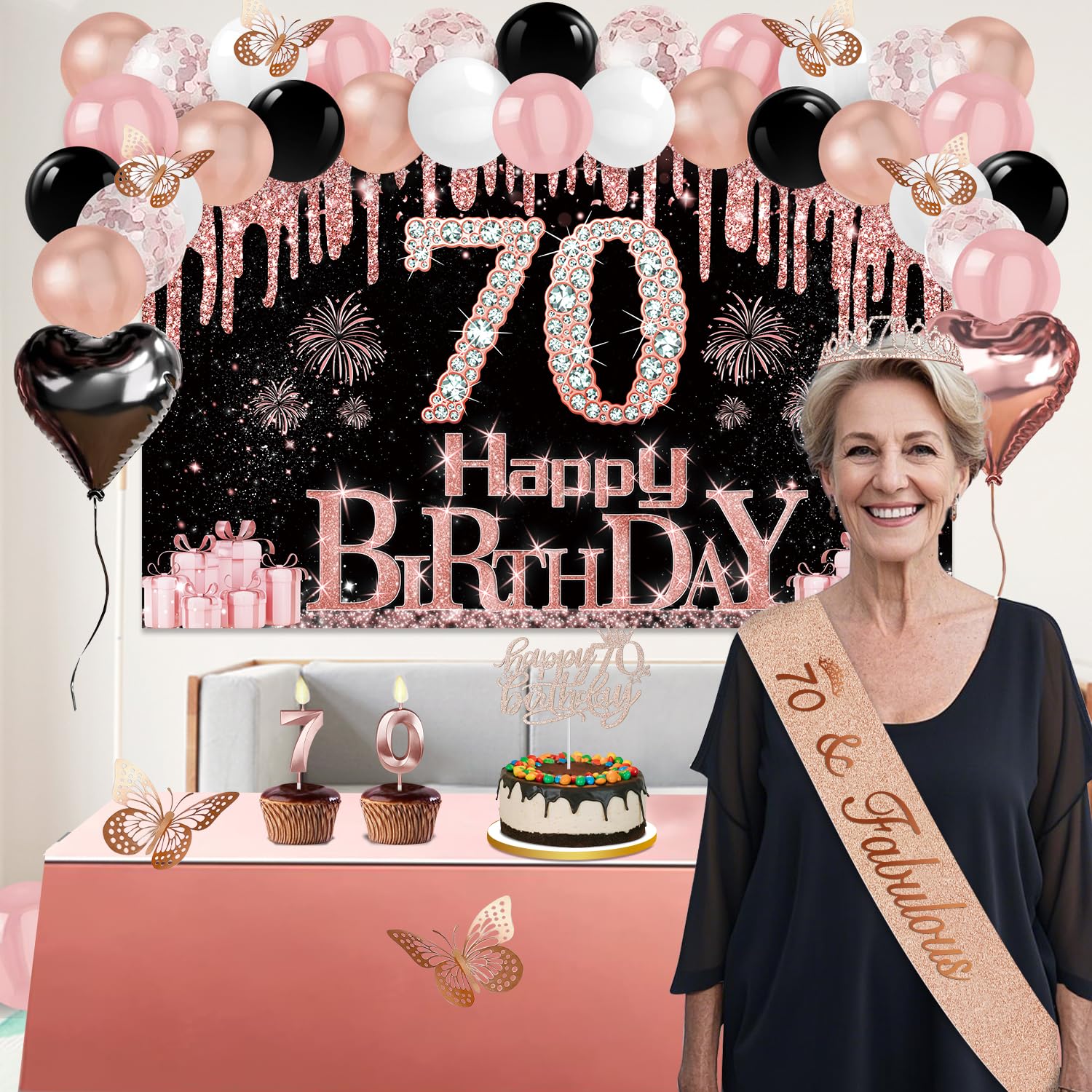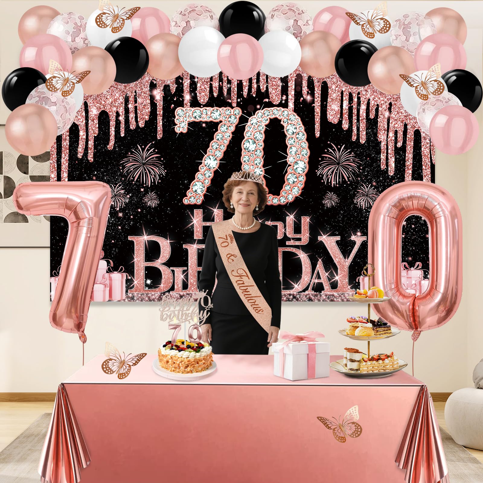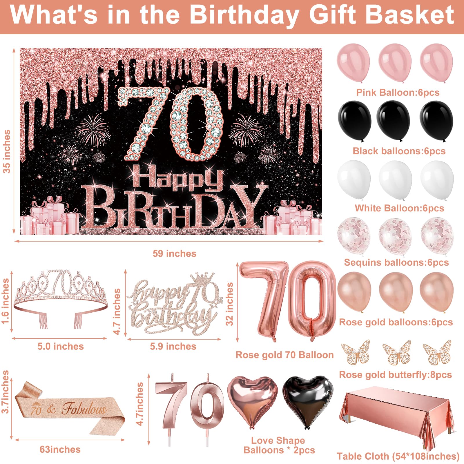70th Birthday Decorations: Package coming with 70th Birthday Banner *1pc, 70th Birthday Tiara *1pc, 70th Birthday Sash *1pc, 70th Birthday Cake Topper *1pc, 70th Birthday Candles *1set, Rose Gold Butterflies *8pcs, Number 70th Birthday Balloons *1set, Love-Shape Balloons *2pcs, Latex Balloons * 30pcs, and Rose Gold Tablecloth *1pc. This complete 49pcs 70th birthday party decoration pack is the best way to meet different decorating needs