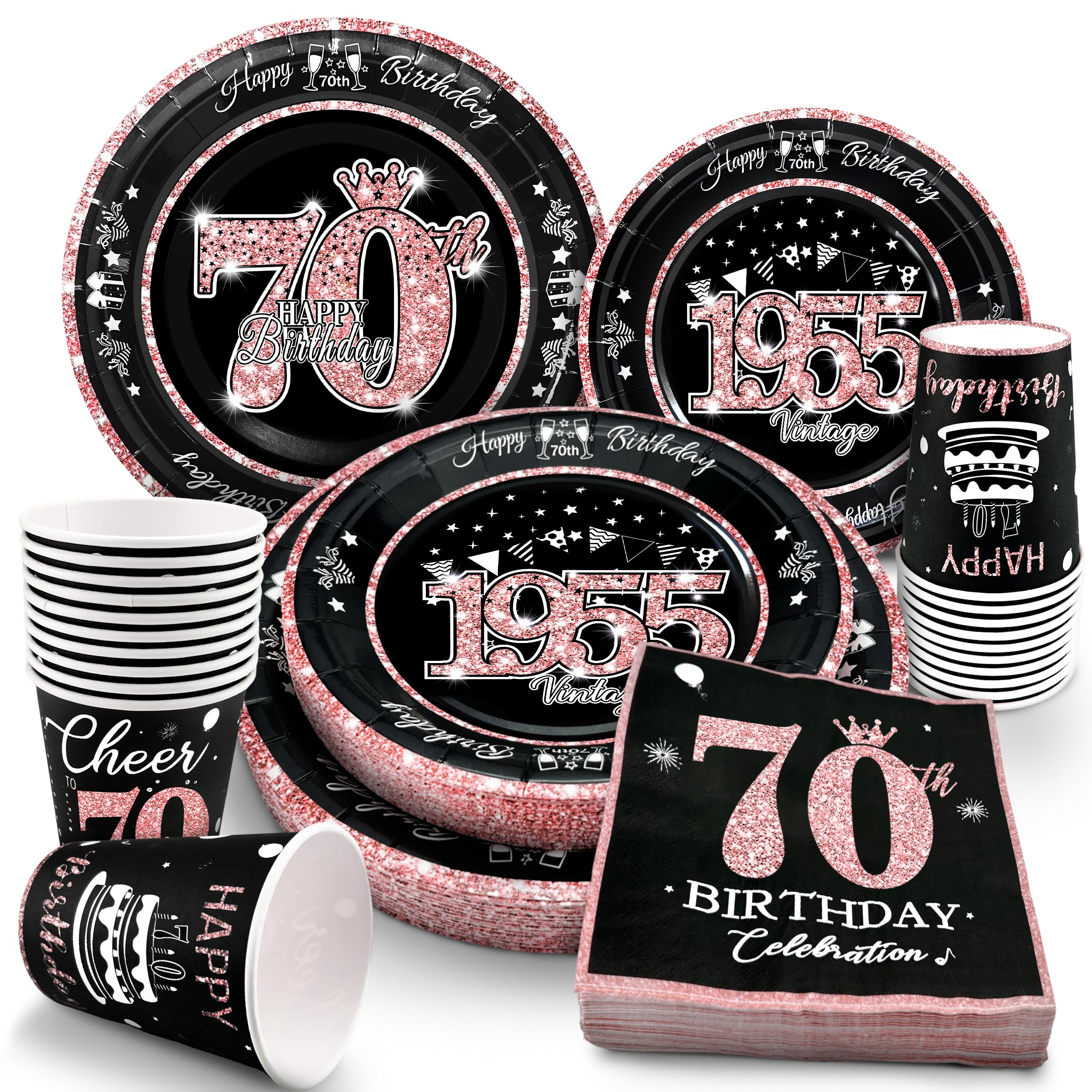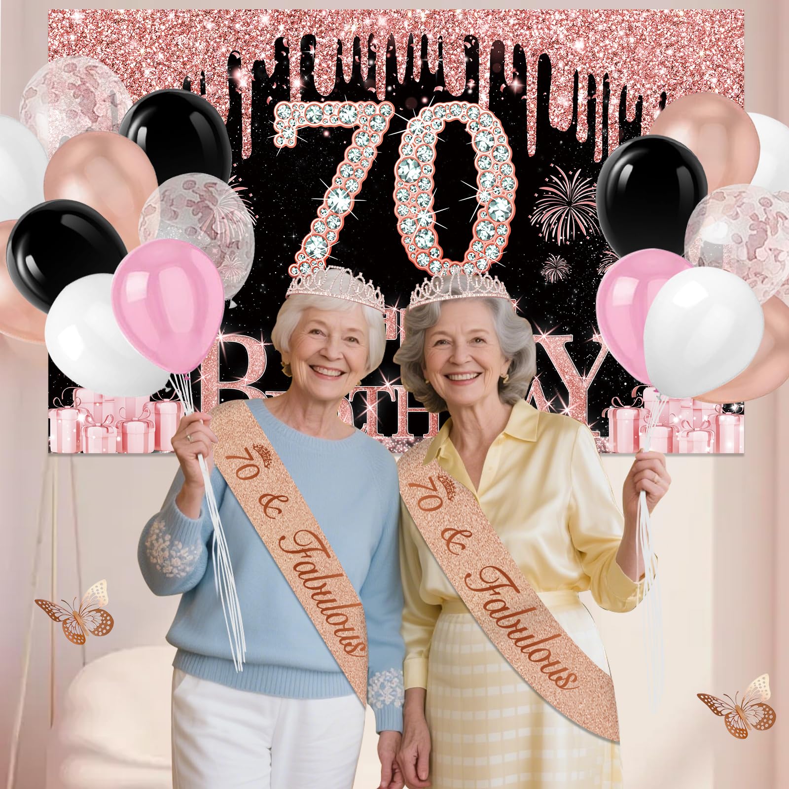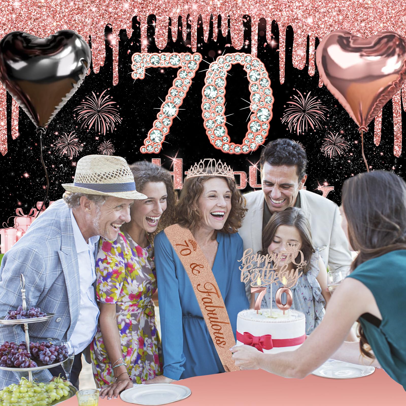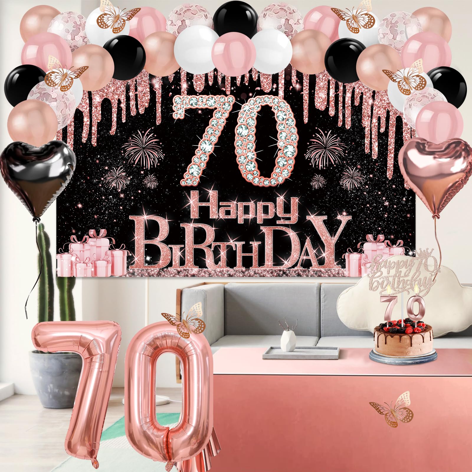 70th Birthday Decorations: Package coming with 70th Birthday Banner *1pc, 70th Birthday Tiara *1pc, 70th Birthday Sash *1pc, 70th Birthday Cake Topper *1pc, 70th Birthday Candles *1set, Rose Gold Butterflies *8pcs, Number 70th Birthday Balloons *1set, Love-Shape Balloons *2pcs, Latex Balloons * 30pcs, and Rose Gold Tablecloth *1pc. This complete 49pcs 70th birthday party decoration pack is the best way to meet different decorating needs
