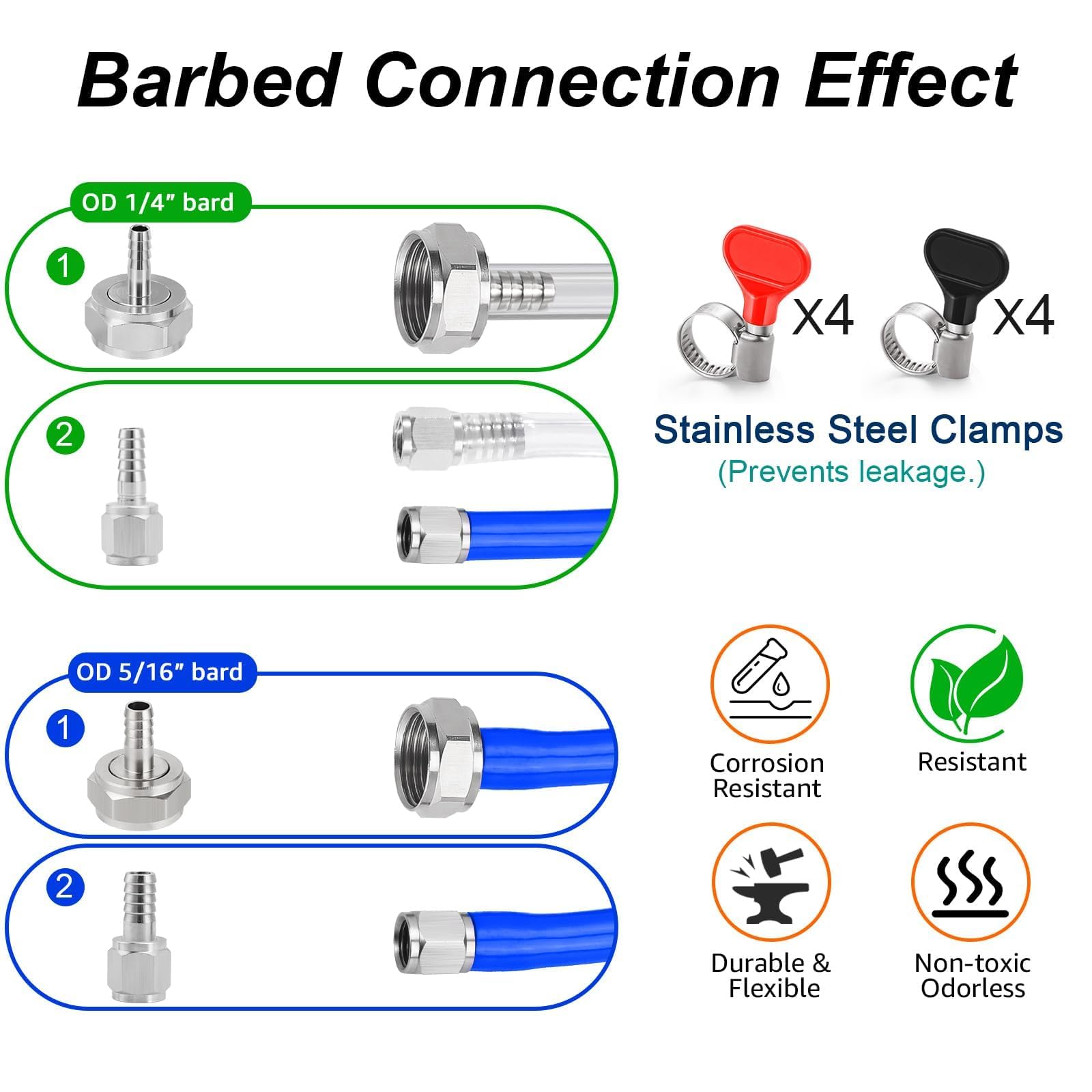 Practical Clamps & Leak-Proof Design: The kit includes 8 stainless steel clamps with adjustable tightening ranges via rotation, ensuring a precise fit for different tubing sizes and secure fastening at every connection point. The airtight sealing structure is specifically designed for CO2 line and beer line tubing connections, effectively preventing gas leaks and abnormal foam formation. This guarantees stable gas delivery and smooth liquid flow, providing reliable assurance for every pour.