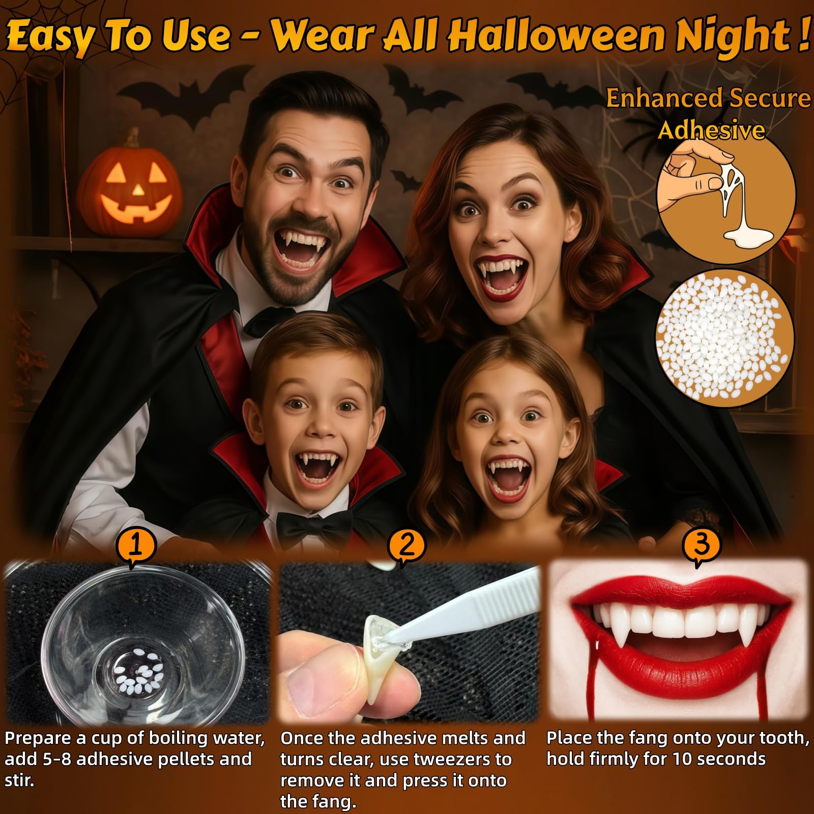 【SO EASY TO USE & Wear All Halloween Night!】: So Easy and Quick to Use, It's Scary! Simply prepare a cup of boiling water and drop 5–8 adhesive pellets into it. Stir until they turn clear and soft, then use the tweezers to take them out and press them into the fang. Place the fang onto your tooth, hold firmly for 30 seconds, and work quickly because the pellets harden fast once they cool. This easy process ensures your fangs stay in place all night, so you can enjoy Halloween worry-free.