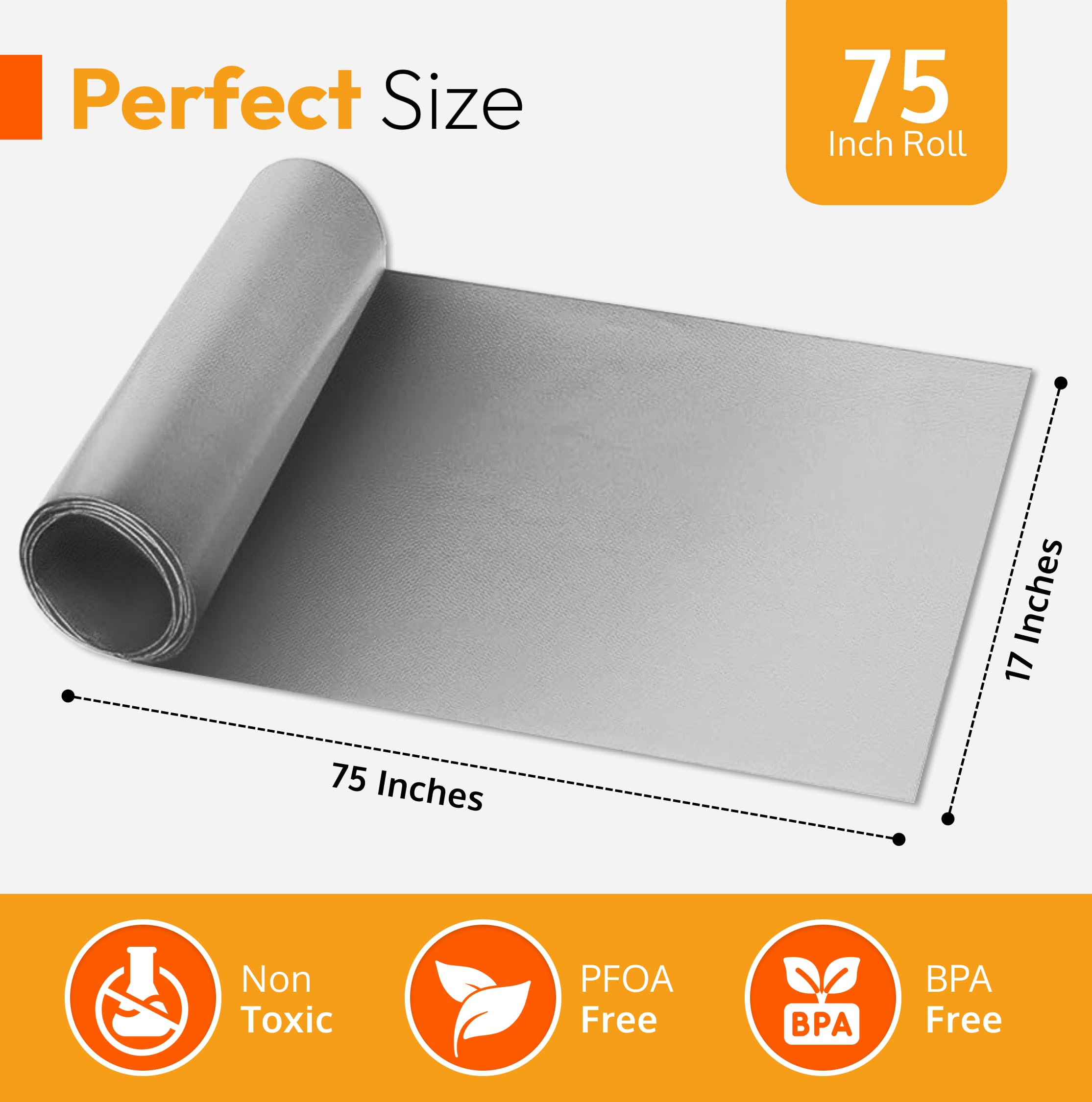 CUT TO SIZE & SHAPE YOU NEED: 75” x 17” liner roll made available for appliances that come in different sizes and shapes. Ideal for those that require longer coverage like grills. Standard grill mats don’t completely cover the entire grill and tendency is, you’d end up using 2 or more sheets. With our teflon sheet roll, you have more than you need to have full coverage. It can be used as an oven liner, grill mat, stovetop cover, baking sheet, microwave liner, etc.