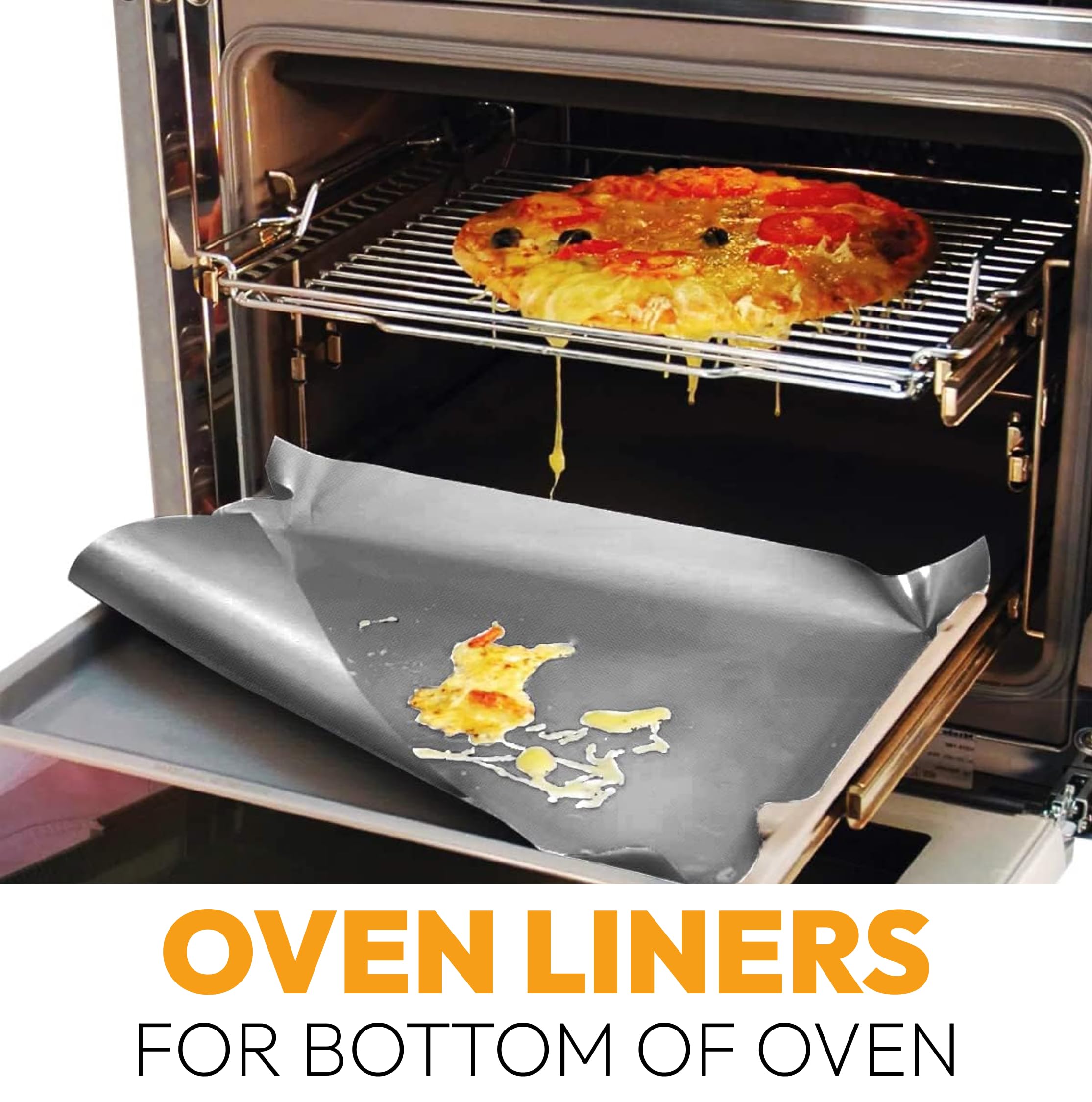 REUSABLE & DISHWASHER SAFE: Removable and can be used over and over. Wipe clean or rinse off effortlessly every single time. When used as oven liner, place them on the lowest rack or tray in gas or electric ovens with a hidden element. For electric ovens with an exposed heating element, slide them correctly under the heating element at the bottom of the oven floor. Avoid direct contact with the heating element or open flame.