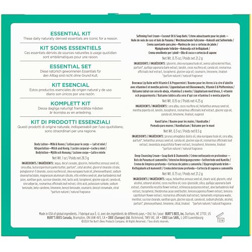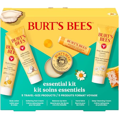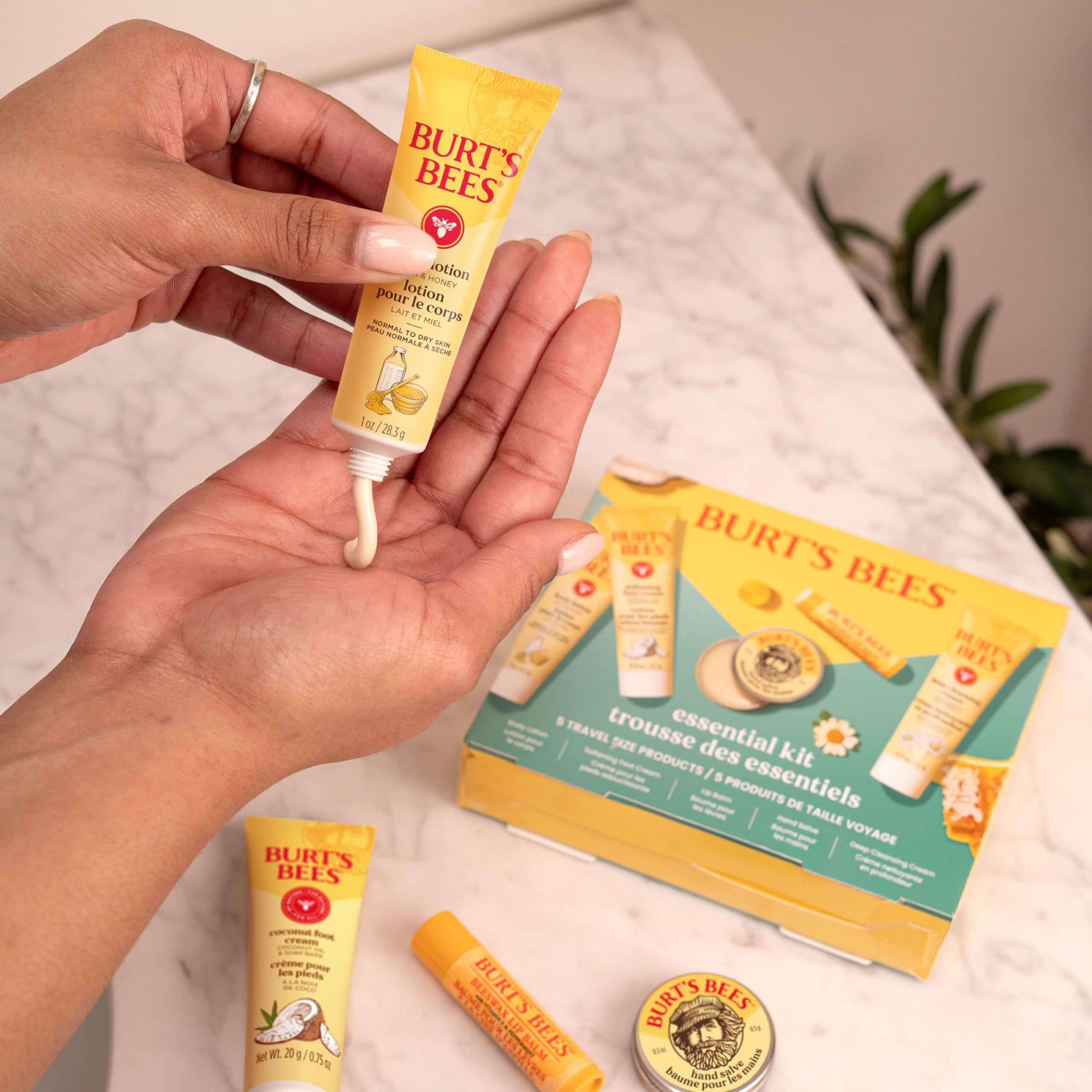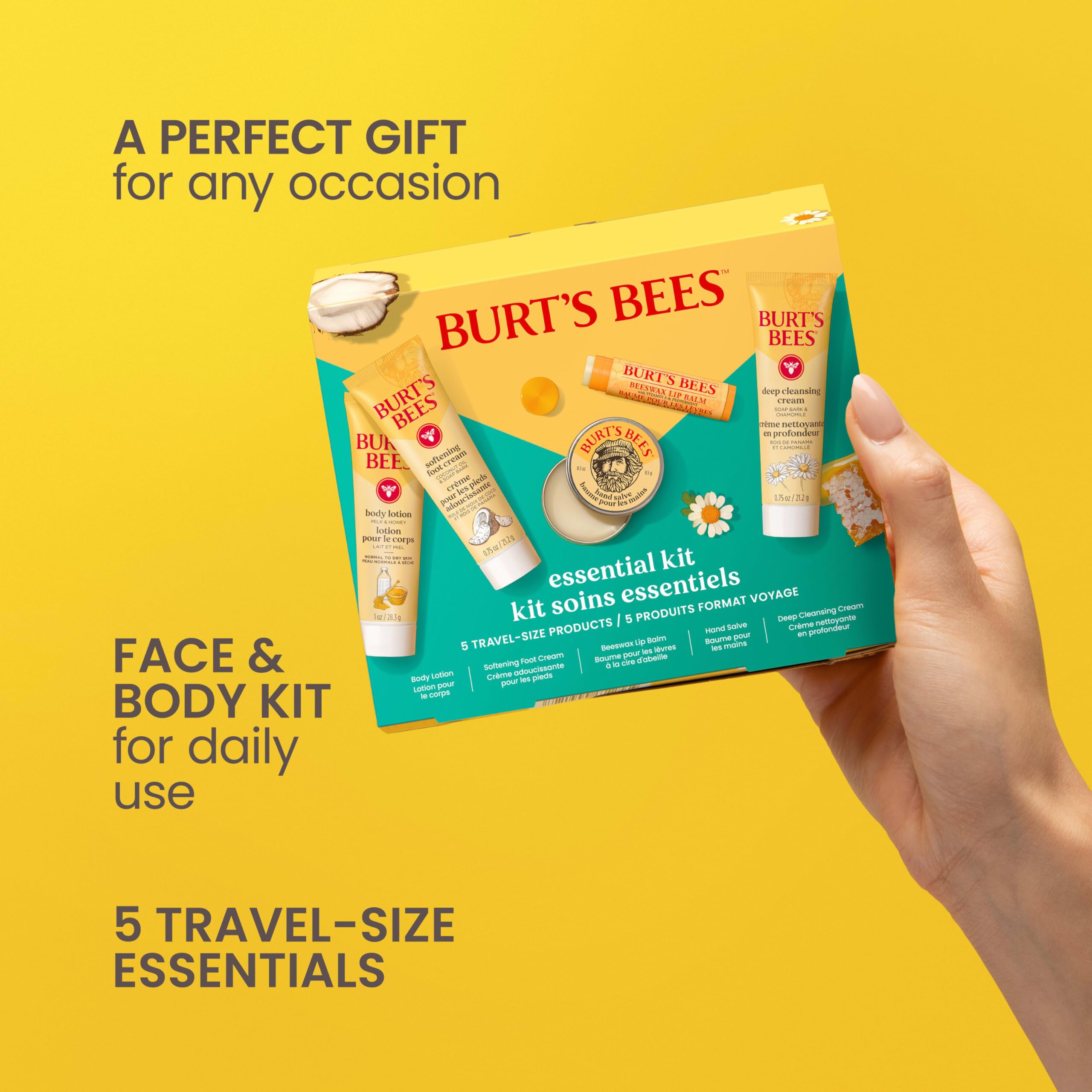 GIFT SET: One Burt's Bees Essential Kit that includes five travel size skin care products, including Deep Cleansing Cream, Softening Foot Cream, Milk and Honey Body Lotion, Hand Salve and Beeswax Lip Balm