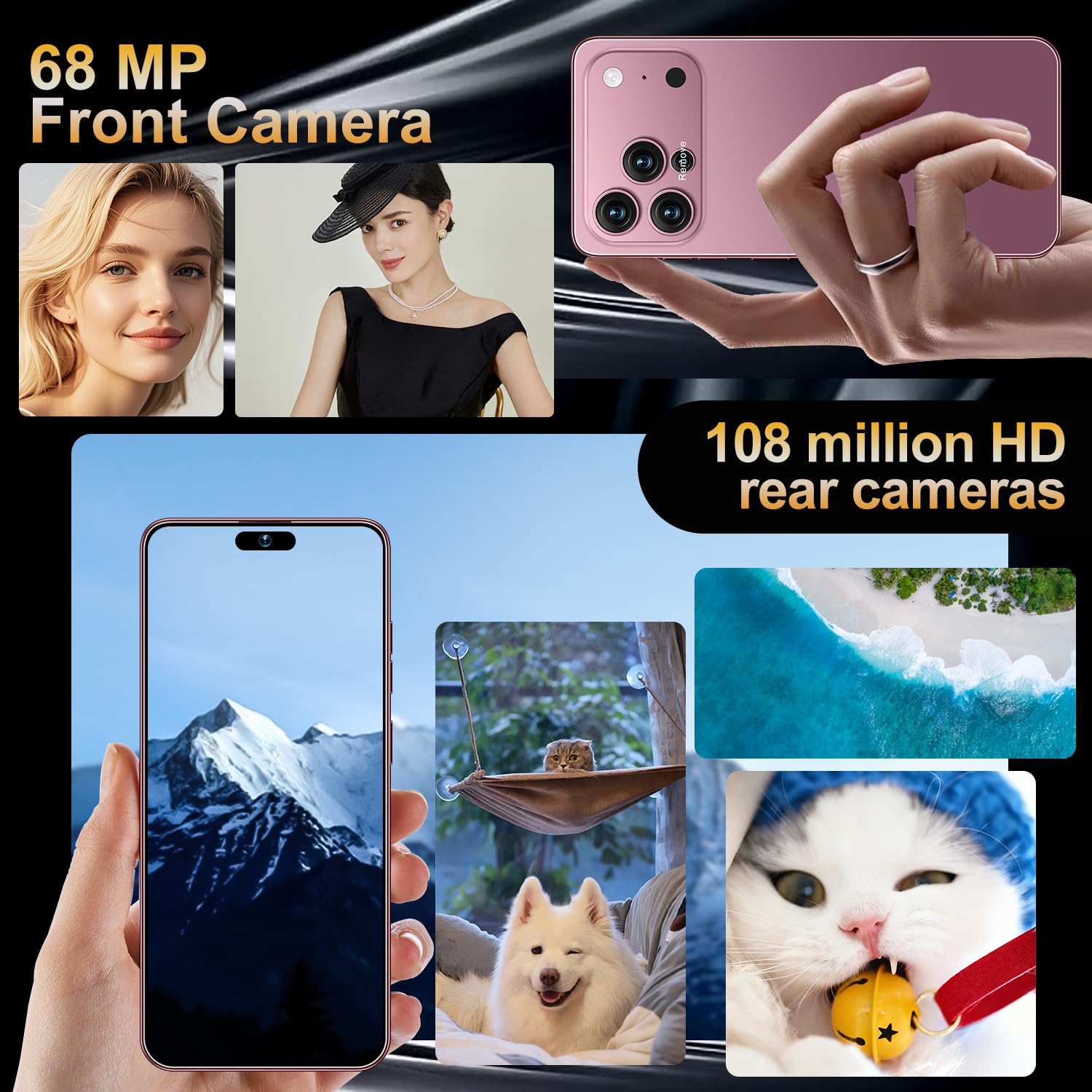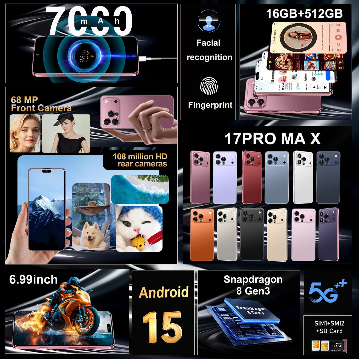 6.99 HD+ Android 15.0 This is an Android Cell phone with a large screen,6.99”HD,This unlocked Android 15.0, 17PROMA X is equipped with a 108MP main camera and a 68MP front facing camera, better recording a beautiful life and showcasing your beauty. And it has facial recognition and Fingerprint button unlock and Quick button for taking photos,which effectively protect your privacy.
