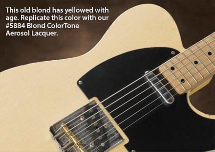 Classic 1950s guitar colors in easy aerosols Genuine nitro guitar lacquerโno spray equipment needed! Fast-drying, durable finish resists water and alcohol. Colors based on aged original guitars Vintage finishes vary a lot. Two guitars sprayed together in 1960 look very different today, depending on where they've been all these years. And neither one looks like the day it left the factory. To get an authentic look for our finishes, Erick Coleman color-matched original guitars. Blond matches a vintage 1955 Fender Esquire. It's a semi-opaque finish, allowing grain to read through. "I see a lot of vintage guitars in my shop. Most aerosols don't really come close to looking like the colors they are intended to. These new ColorTone finishes nail the look of vintage beauties I've had on my bench." โErick Coleman, guitar repairman and StewMac tech advisor ColorToneยฎ Classic Colors Aerosols can be sprayed over smooth unfinished wood; over sanded grain filler; over sanding sealer, and over ColorTone Stains. Add topcoats of ColorTone Clear Aerosol Guitar Lacquer for a deep hard gloss. A complete guitar typically requires 1 can of sealer, 1 can of color, and 4-6 cans of clear topcoat. For best results, use warm lacquer, not cold. Professionals spray warm lacquer to reduce spatters which require sanding. Warm your aerosol cans in a sink of warm tap water. 13-ounce aerosol cans.