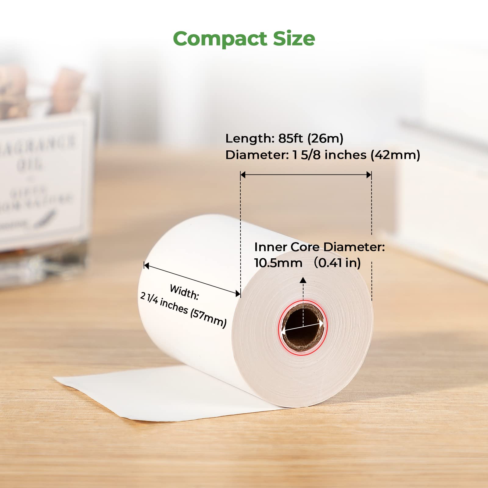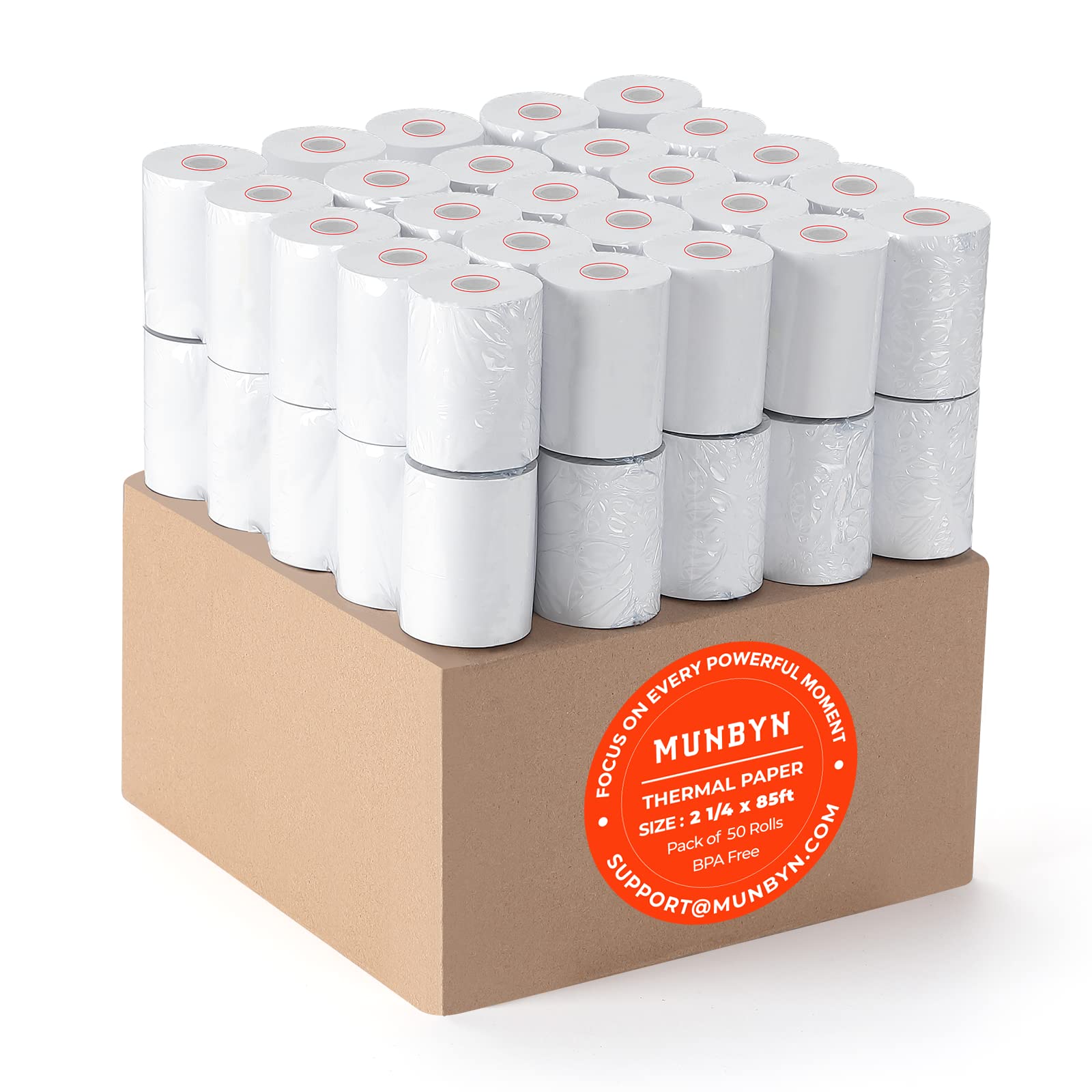 [Compact Size] 2 1/4" x 85ft thermal paper rolls (50 Rolls/ Case)--W x D x L = 2 1/4 inches (57mm) x 1 5/8 inches (42mm) x 85ft (26m). More paper at a lower cost for our MUNBYN customers