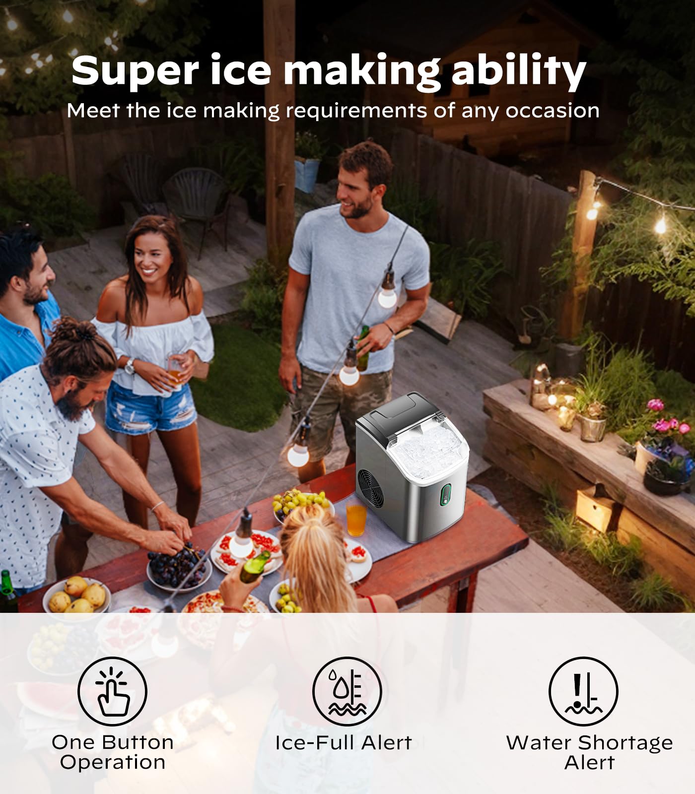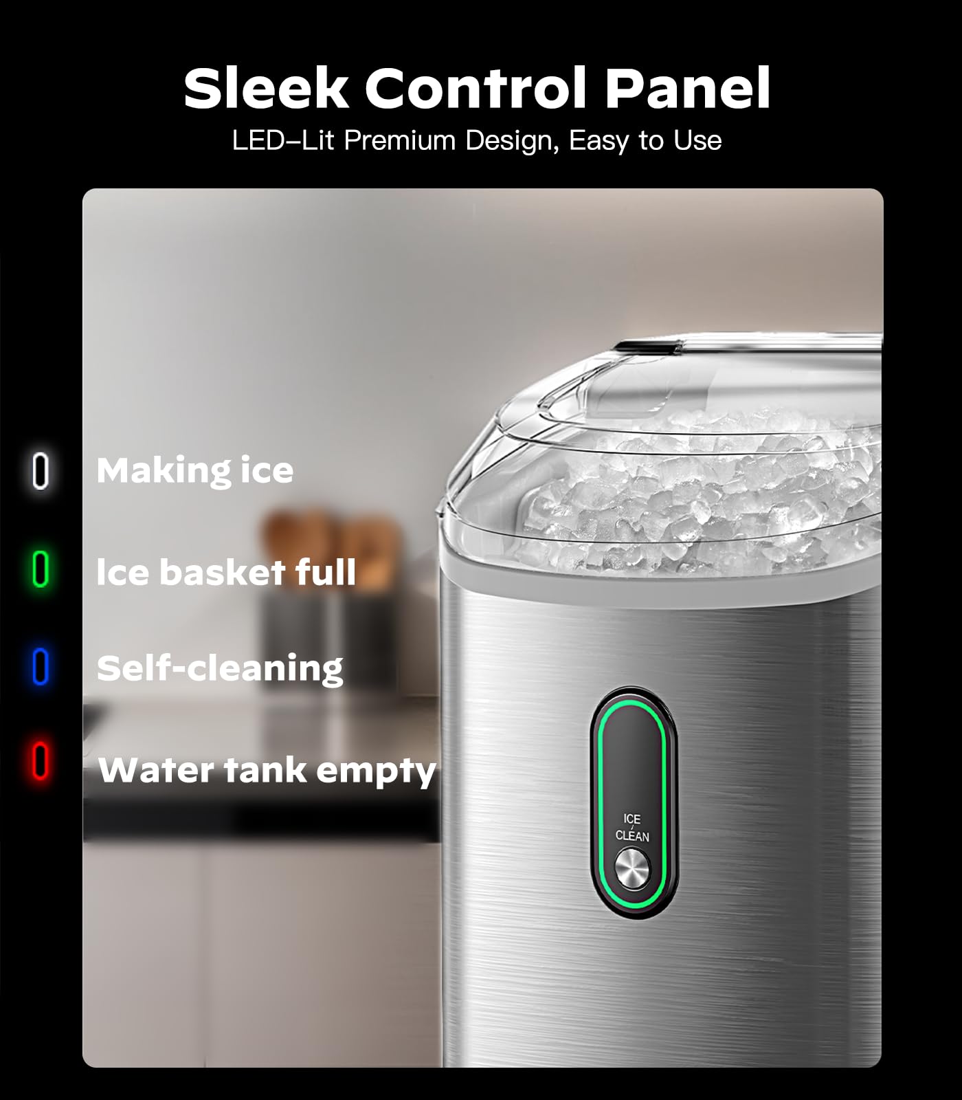 Whisper-Quiet Operation: Experience the tranquility of our nugget ice maker countertop, engineered for a quiet cooling process, making it one of the most silent models on the market. Enjoy seamless ice production without disturbing your home or office environment. Plus, an indicator light conveniently alerts you when water levels are low or the ice basket is full