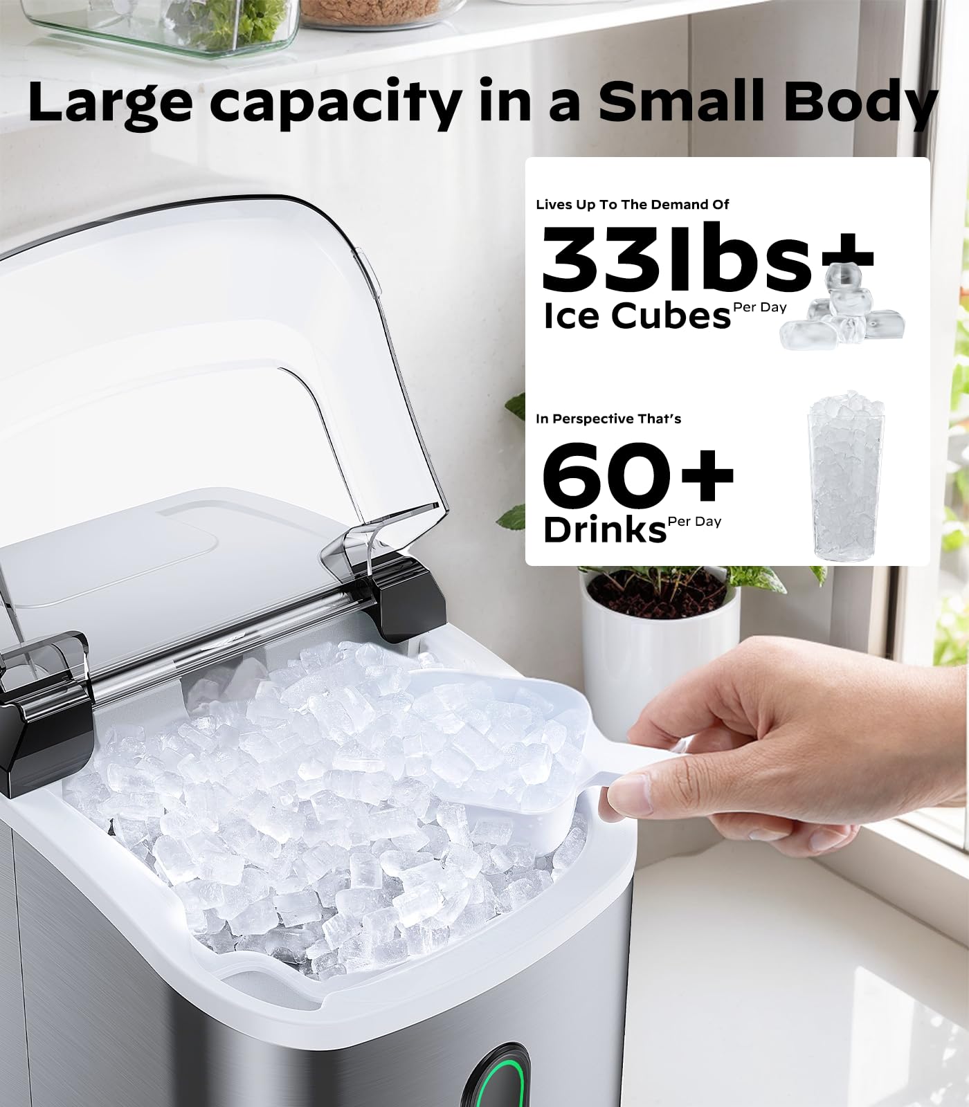 Rapid Ice Production: Experience lightning-fast ice-making with the Nugget Ice Maker, capable of producing up to 33 pounds of chewable ice daily. Enjoy your first batch in just 6 minutes, this sonic ice maker significantly quicker than the average 20 minutes of traditional ice makers