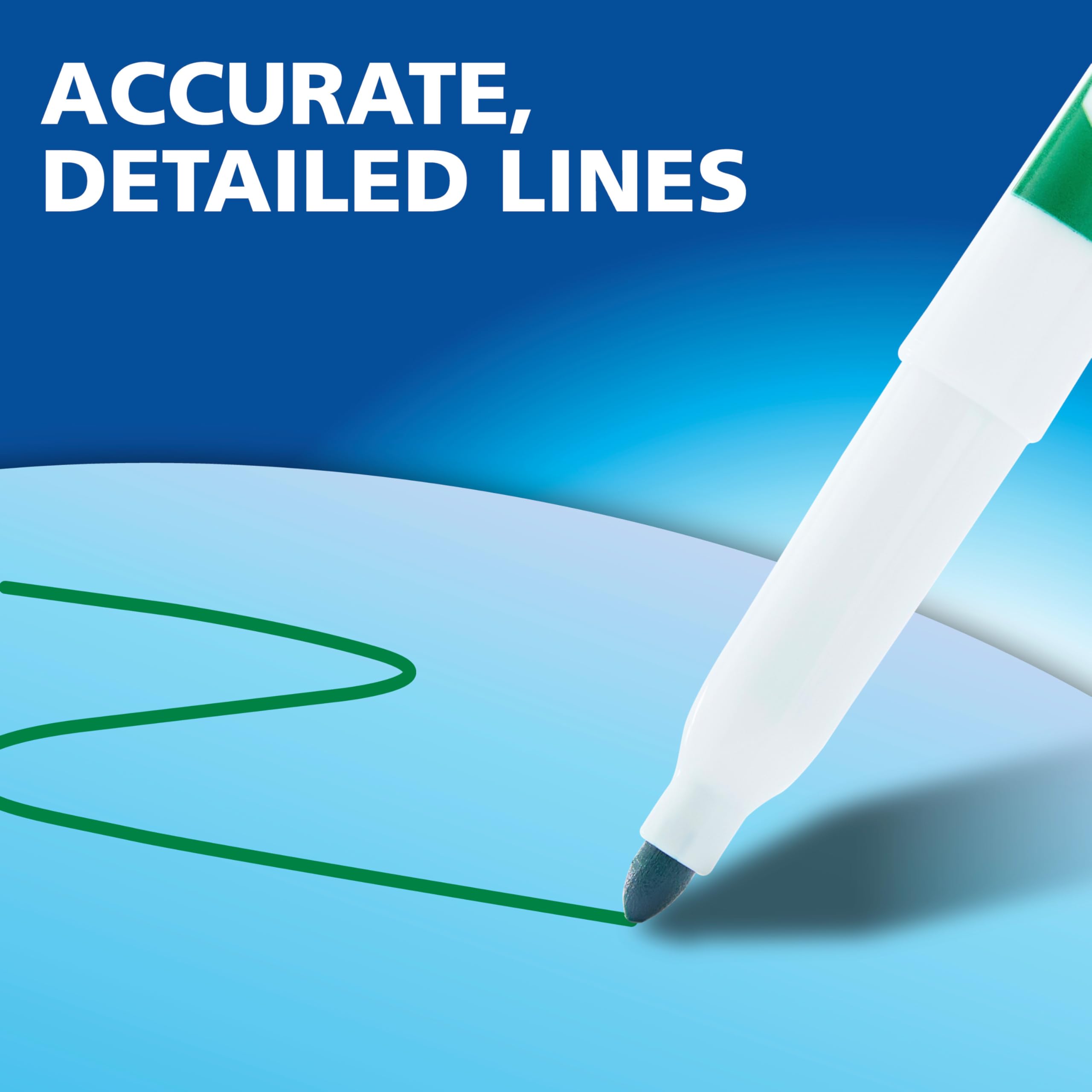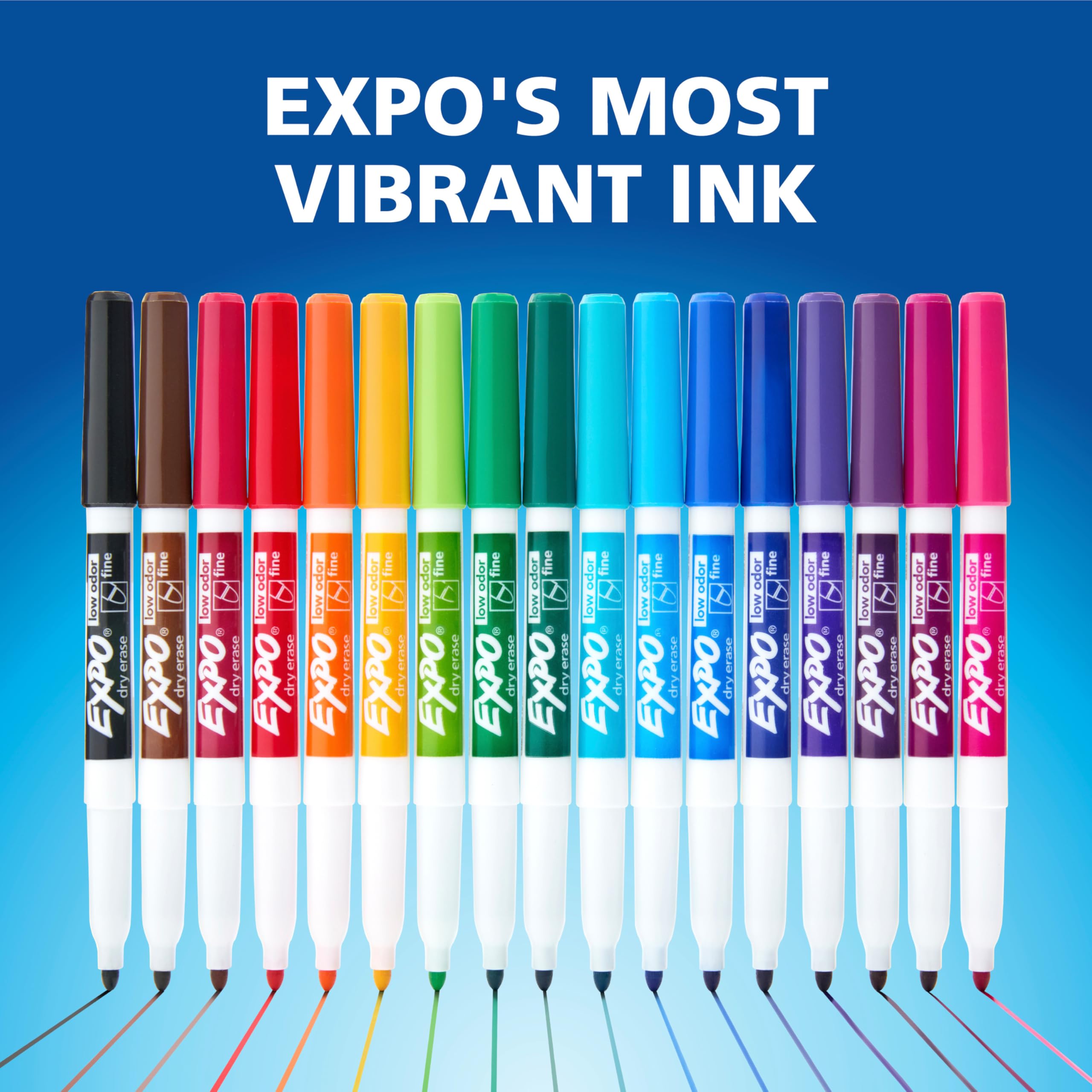 Track, schedule, collaborate, and present with vibrant Expo Fine Dry Erase Markers. They feature vivid ink and exciting colors that stand out—perfect for planning, presentations, lessons, calendar boards, and personal organization. With an EXPO eraser, these EXPO markers erase cleanly and easily from whiteboards and most nonporous surfaces. The low odor ink is perfect for classrooms, offices, and homes, while the fine tip is great for accurate, detailed lines.