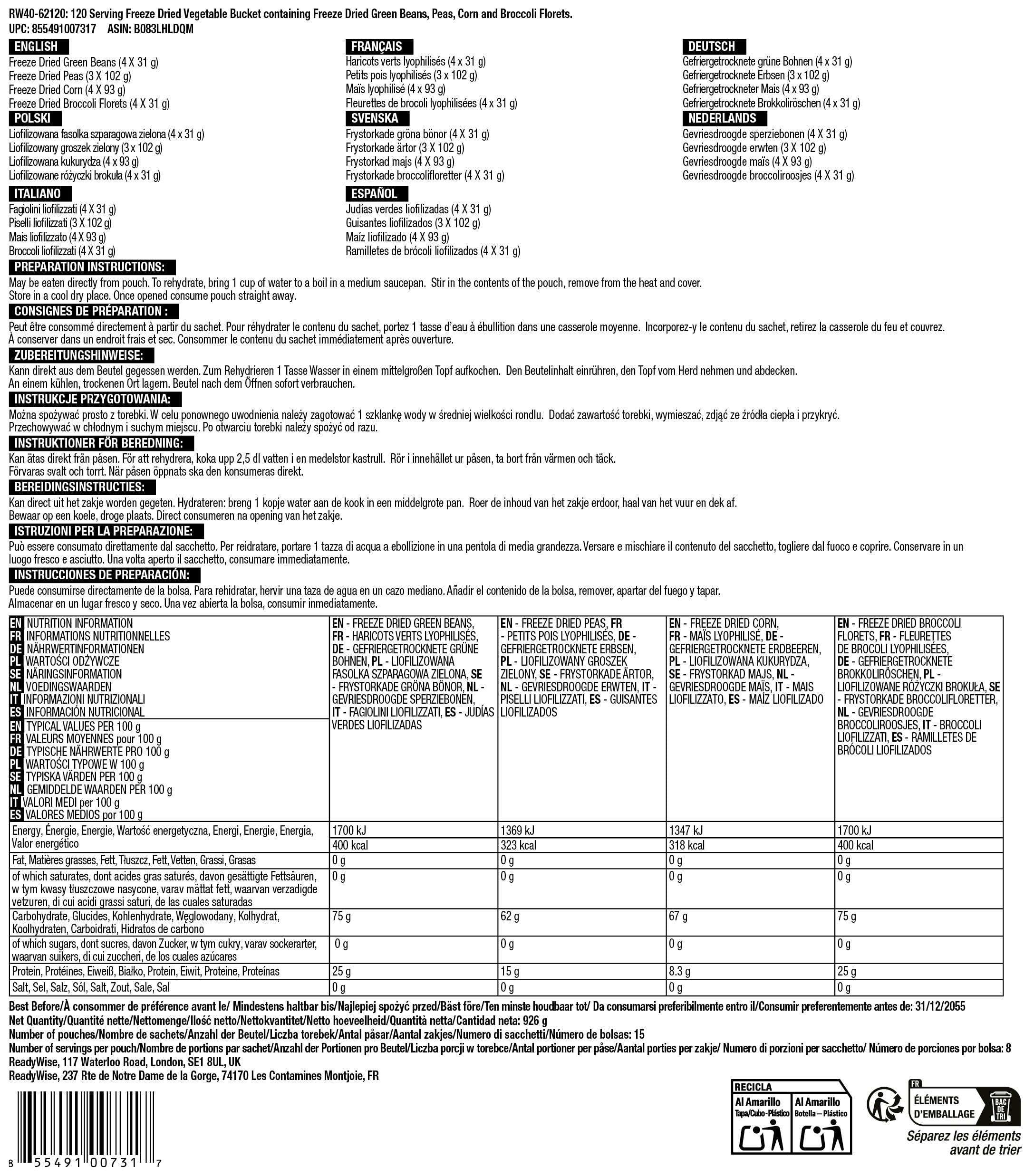 SURVIVAL ESSENTIAL: With 120 servings of Freeze Dried Vegetables, ReadyWise Emergency Bucket is the perfect starting point for anyone serious about preparing for the future. Stay ready for anything, from power outages to outdoor adventures!