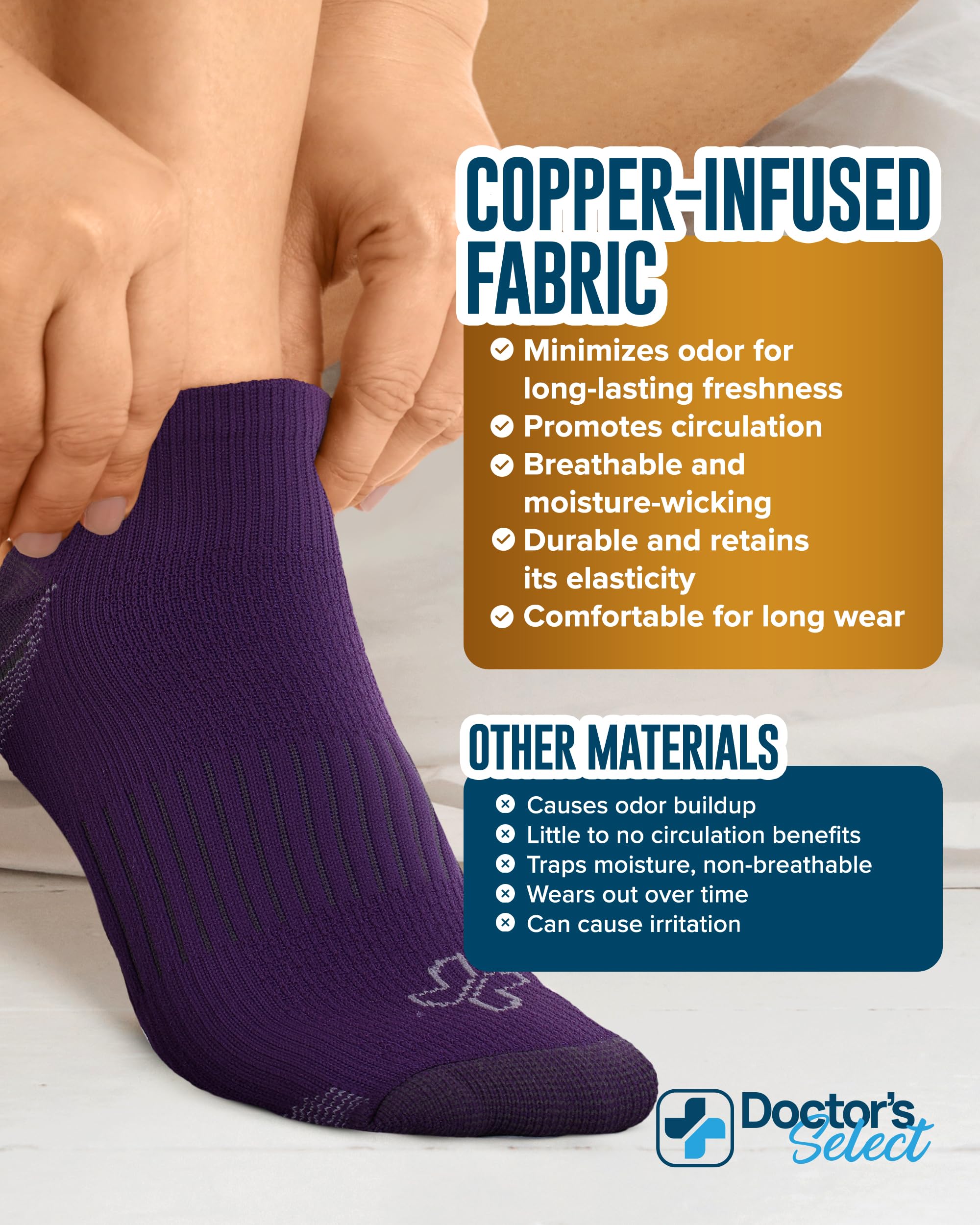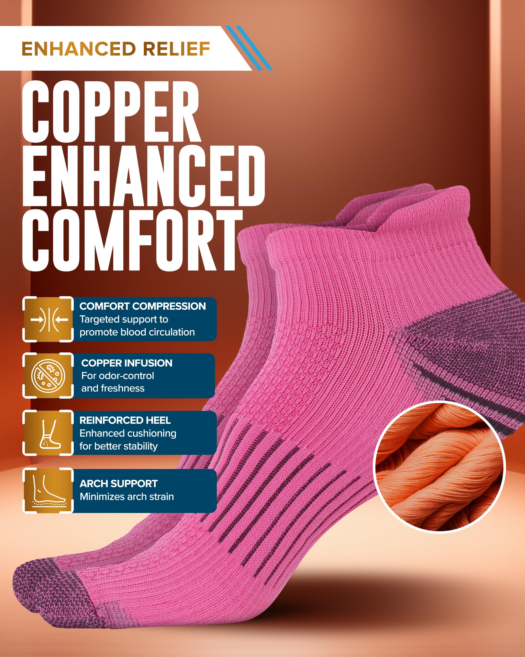 Experience Copper-Infused Freshness - Keep your feet fresh around the clock with copper infused socks crafted to fight odor and moisture. Whether you're on the move or unwinding, these socks deliver support with every step.