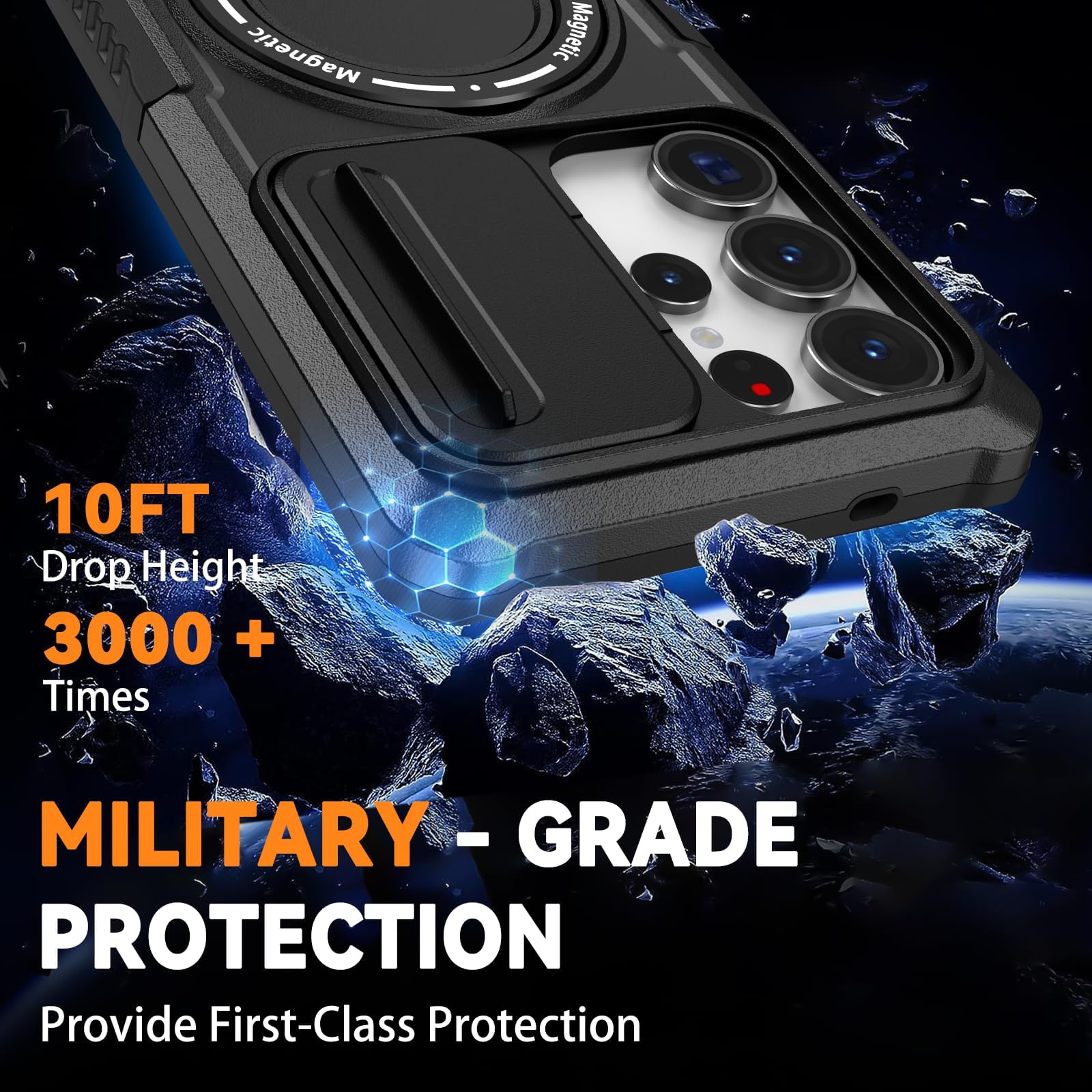 【Military Grade Protective】This Samsung Galaxy S25 Ultra 6.9 inch cover certified by the Military Standard, survived over 3,000+ drop tests from up to 10 FT. Provides excellent shock and drop protection, protecting your phone from accidental drops, shock, bumps, impacts, and scratches. A 2.0 mm offset border over the camera opening prevents the lens from being scratched; a 1.2 mm bezel over the screen keeps your iPhone screen from damage.