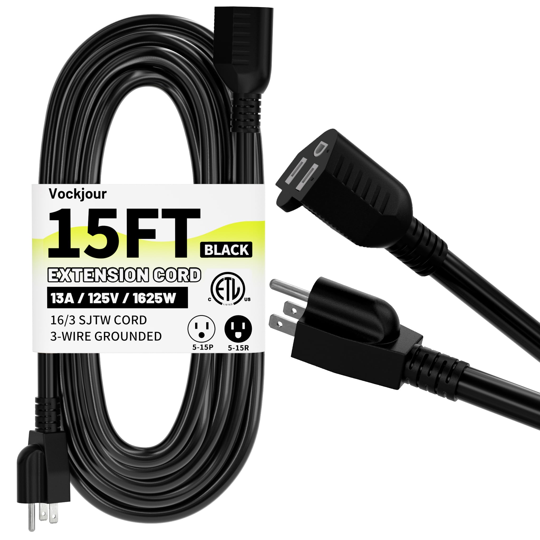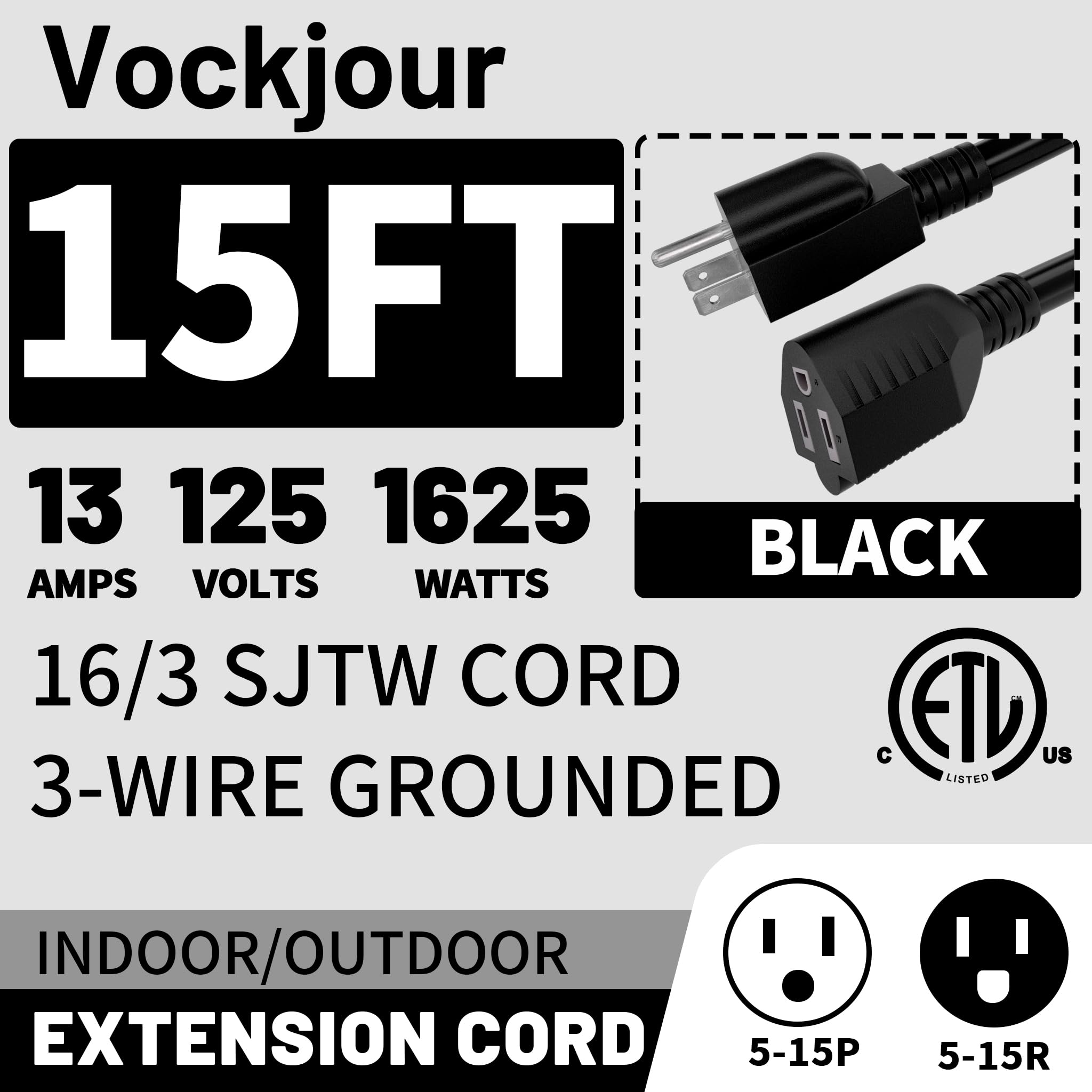 ETL Listed:16 AWG extension cord 15 ft, 125 volts, 13 amps, 1625 watts, 5-15P/R,3 prong extension cord Temperature Range -58°F to +158°F; Heavy duty extension cord ETL/cETL Approved