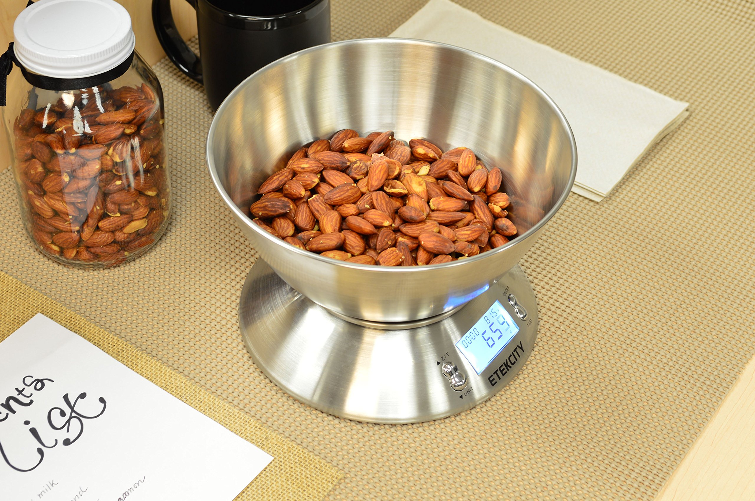 Simply Accurate - With a weight capacity of 11 pounds (5 kilograms) and graduation of 0.1 ounces (1 gram), this Etekcity digital kitchen scale has the accuracy to meet your personal and commercial needs. The compact and lightweight design makes it ideal for homes, kitchens, offices, mailrooms, and more. The scale clearly displays measurement results in g, kg, oz, and lb: oz on the digital LCD display the instant any weight is applied. Removable Bowl Design - The digital scale was designed with a stainless steel detachable bowl, great for measuring mixed ingredients and tare measurements. When not in use, the bowl can be flipped upside down and placed over the scale unit to be used as a protective case, making it easy to store without taking up too much space. Automatic Convenience - Save energy and save time. The zero and tare functions are featured for accuracy when weighing items individually or in containers. After 2 minutes of inactivity, the digital scale will trigger the auto-off function, prolonging the battery lifespan. It also provides low battery and overload indications. Save energy and simplify your life without lifting a finger. Specifications Weight Capacity: 1 oz / 1 g-11 lb:oz / 5 kg Increments: 1 g Measurement: oz / lb:oz/ g / kg Bowl / Storage Size: 8.3 x 8.3 x 3.7 in (L x W x H) Scale Size: 7.52 x 7.52 x 1.9 in (L x W x H) Package Contents 1 x Digital Kitchen Scale 1 x Stainless Steel Removable bowl 2 x 1.5V AAA batteries(Pre-installed) 1 x Quick Start Guide.