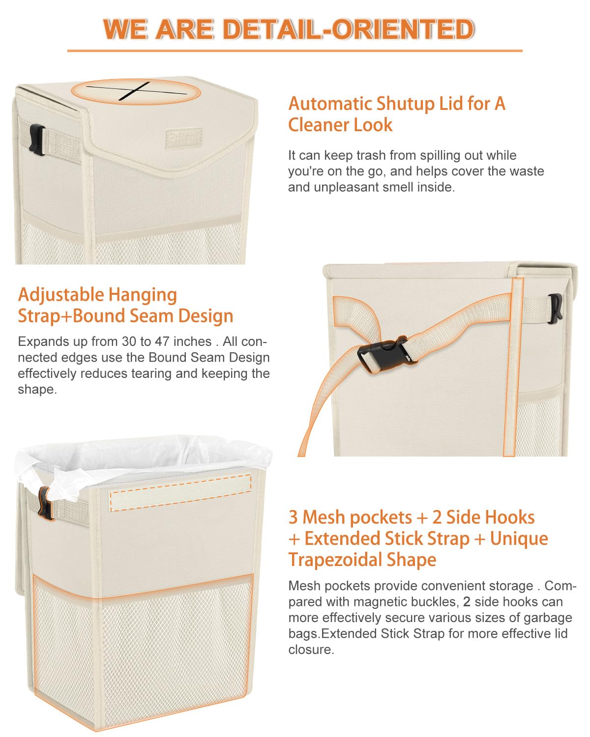 Extra PVC Plate for Keeping Shape:Currently, many suppliers use cheaper side braces to maintain the shape of the garbage can in order to save product costs. However, in our tests, it was not only difficult to install but also unsatisfactory in maintaining its shape. After repeated design and testing, we added PVC plates to the front and back, which can maintain the shape of the trash can more effectively and conveniently for use without installation.