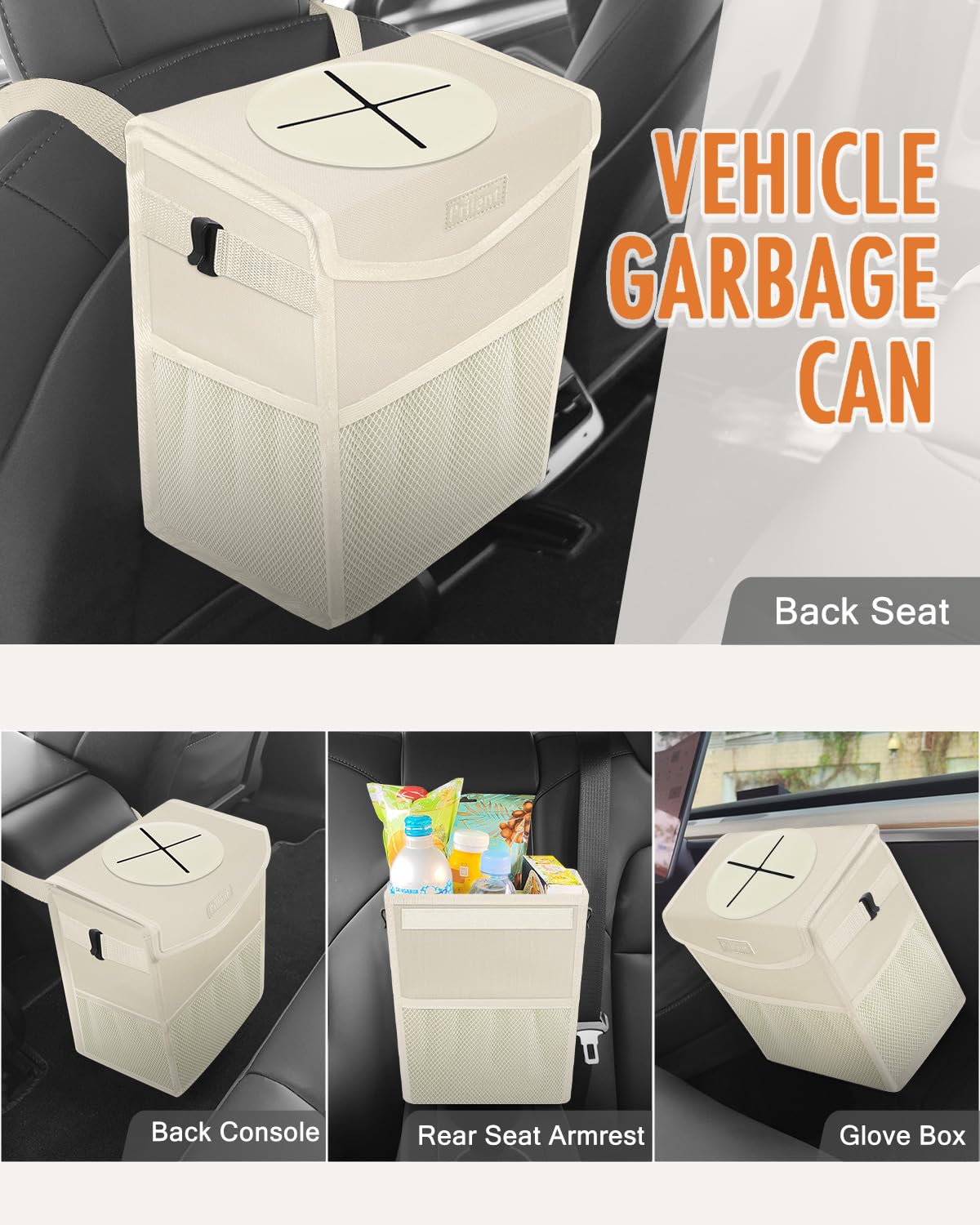 Practical PU Leather Cover & Unique Trapezoidal Shape:A garbage bin without a lid is like a garbage display box, which is embarrassing when there are other passengers. A trash can with a lid can make it look cleaner and tidier. It can keep trash from spilling out while you're on the go, and helps cover the waste and unpleasant smell inside. Designed with a quick-sealing PU leather lid, which can put objects in by just pushing it through the lid, and it will shut off automatically.