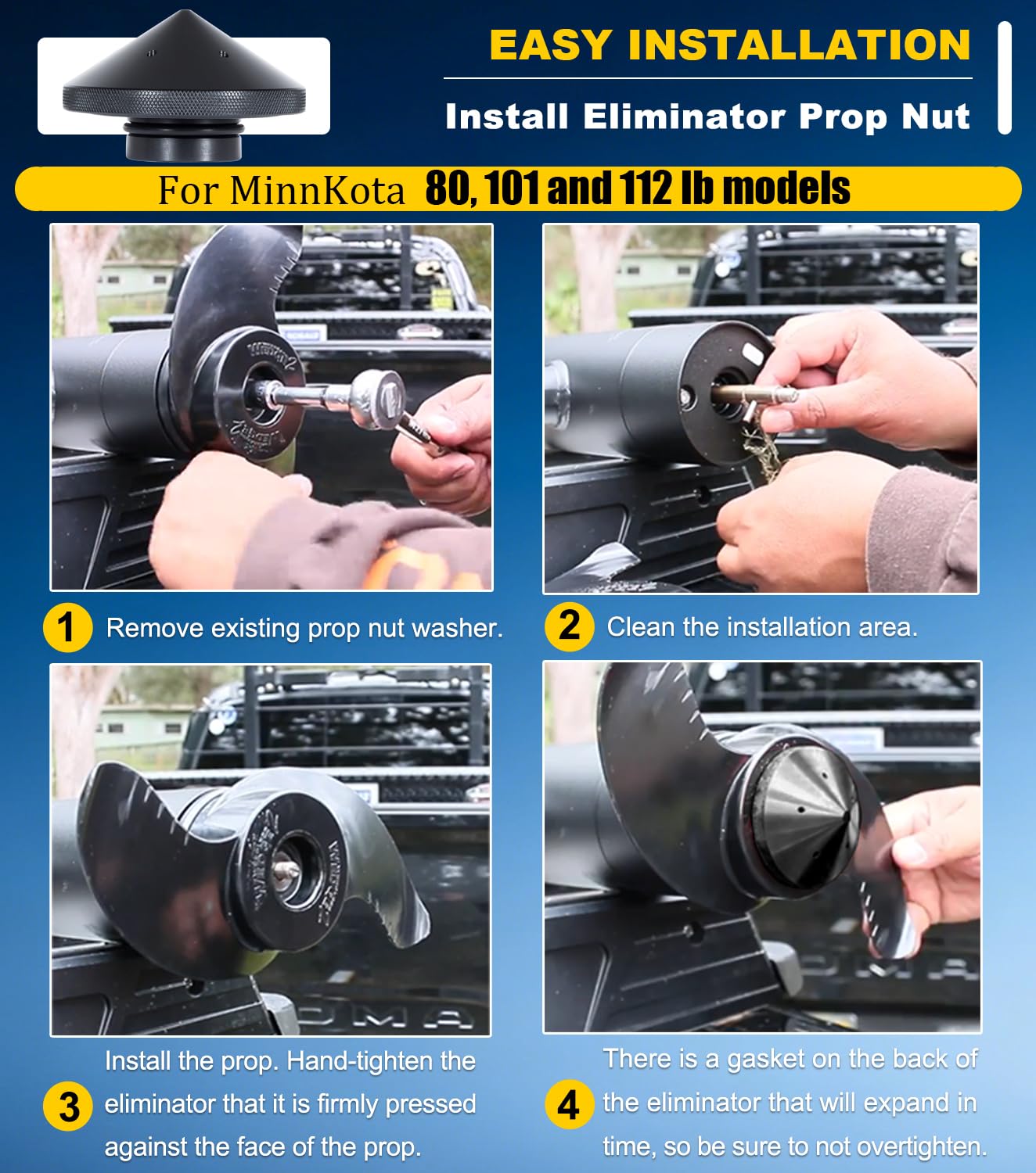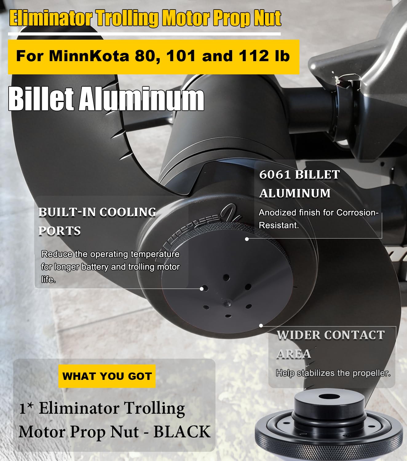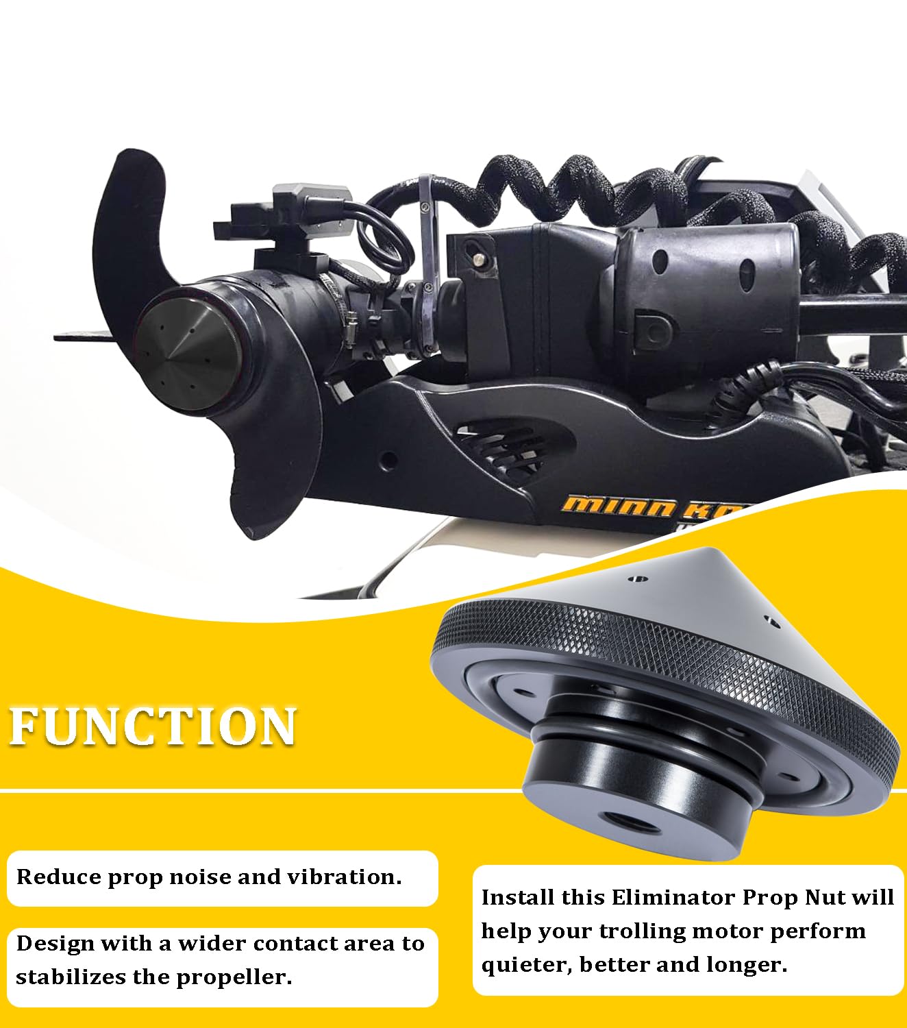 FUNCTION -- Reduce prop noise and vibration. Design with a wider contact area to stabilizes the propeller. Install this Eliminator Prop Nut will help your trolling motor perform quieter, better and longer.