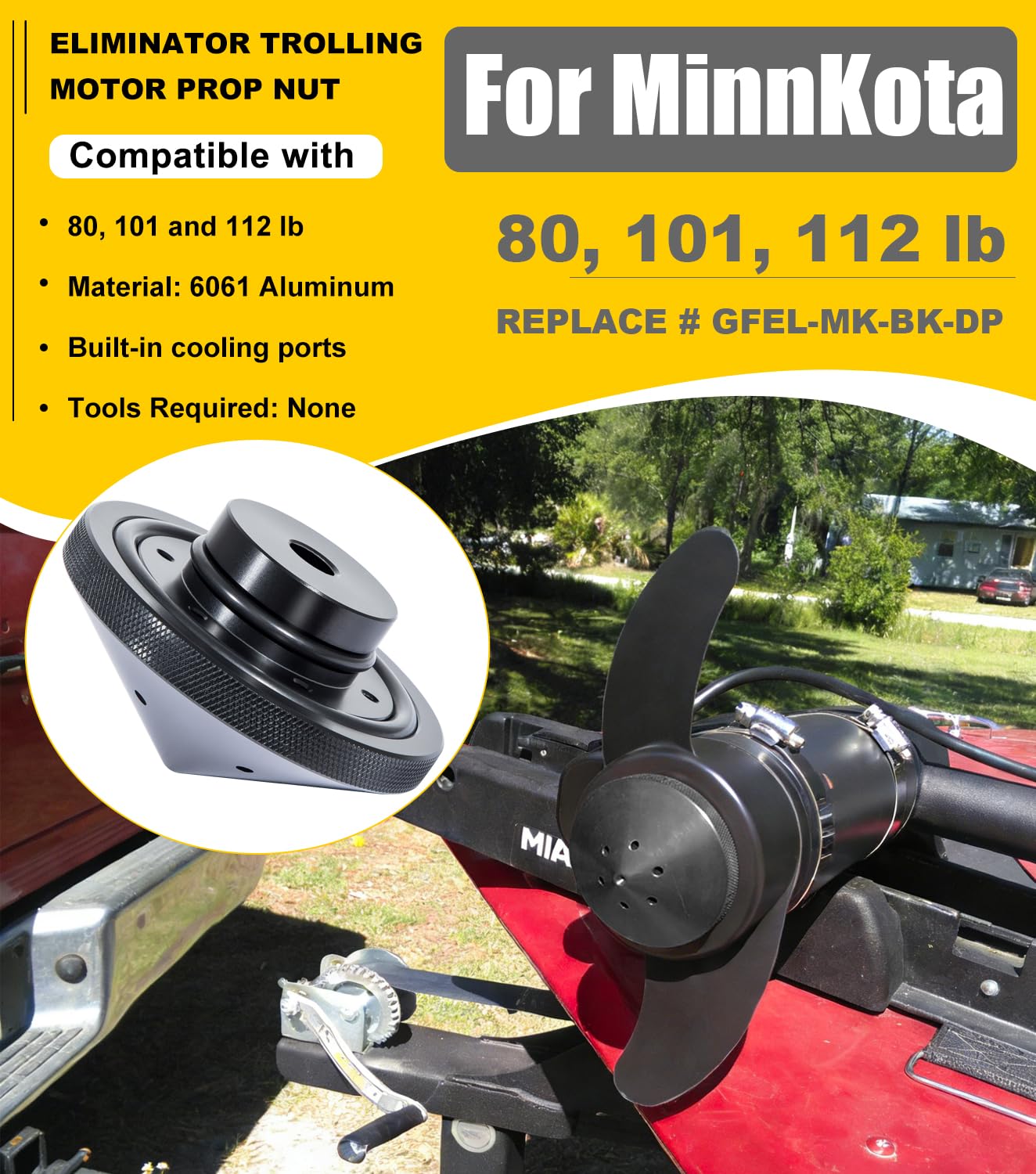 APPLICATION -- Suitable for MinnKota 80, 101 and 112 lb models. Replace # GFEL-MK-BK-DP. ( NOTE: For Minn Kota Maxxum and for Terrova trolling motors will require a for Weedless Wedge 2 or 3 prop to use our Eliminator. )