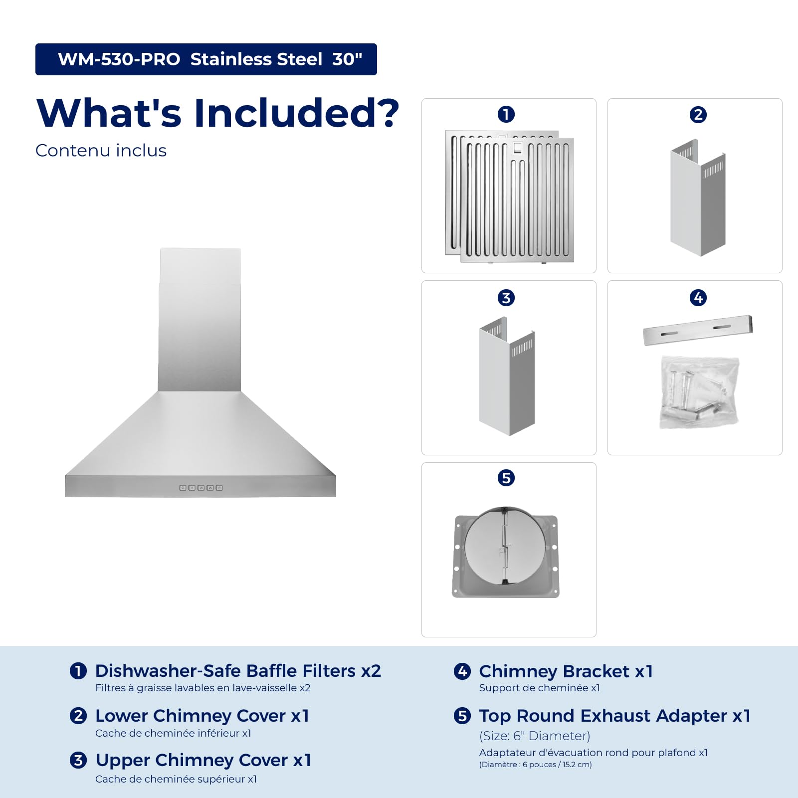 WHAT'S INCLUDED: Dishwasher-safe baffle filters (2), lower chimney cover (1), upper chimney cover (1), chimney bracket (1) and 6” round exhaust adapter (1)