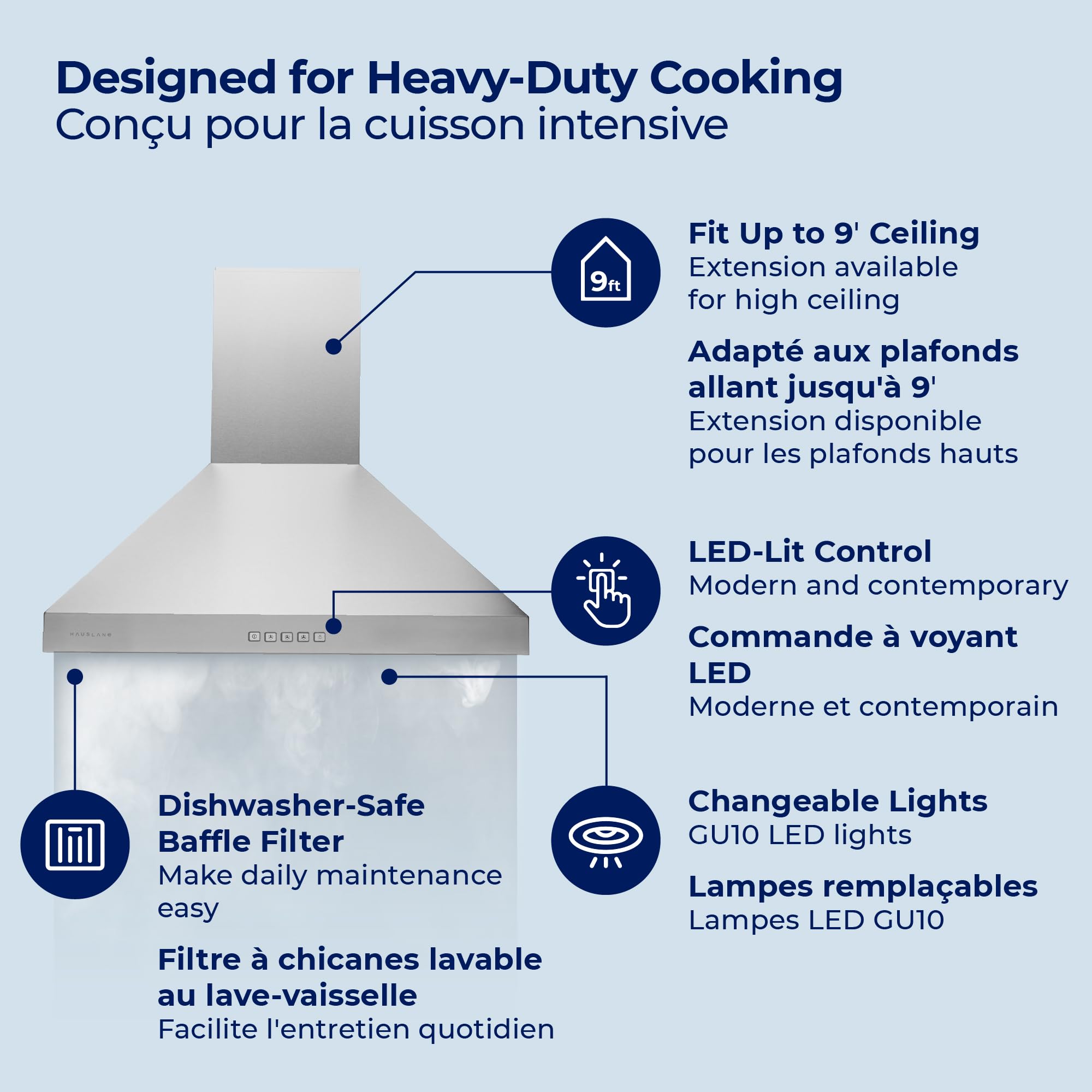 PERFECT FOR HIGH CEILINGS: Fits kitchens with ceilings up to 9 ft. Extension kit available for 10 ft. ceilings (sold separately). Easily converts to ductless with a pair of effective charcoal filters (sold separately). Designed for 6” duct.