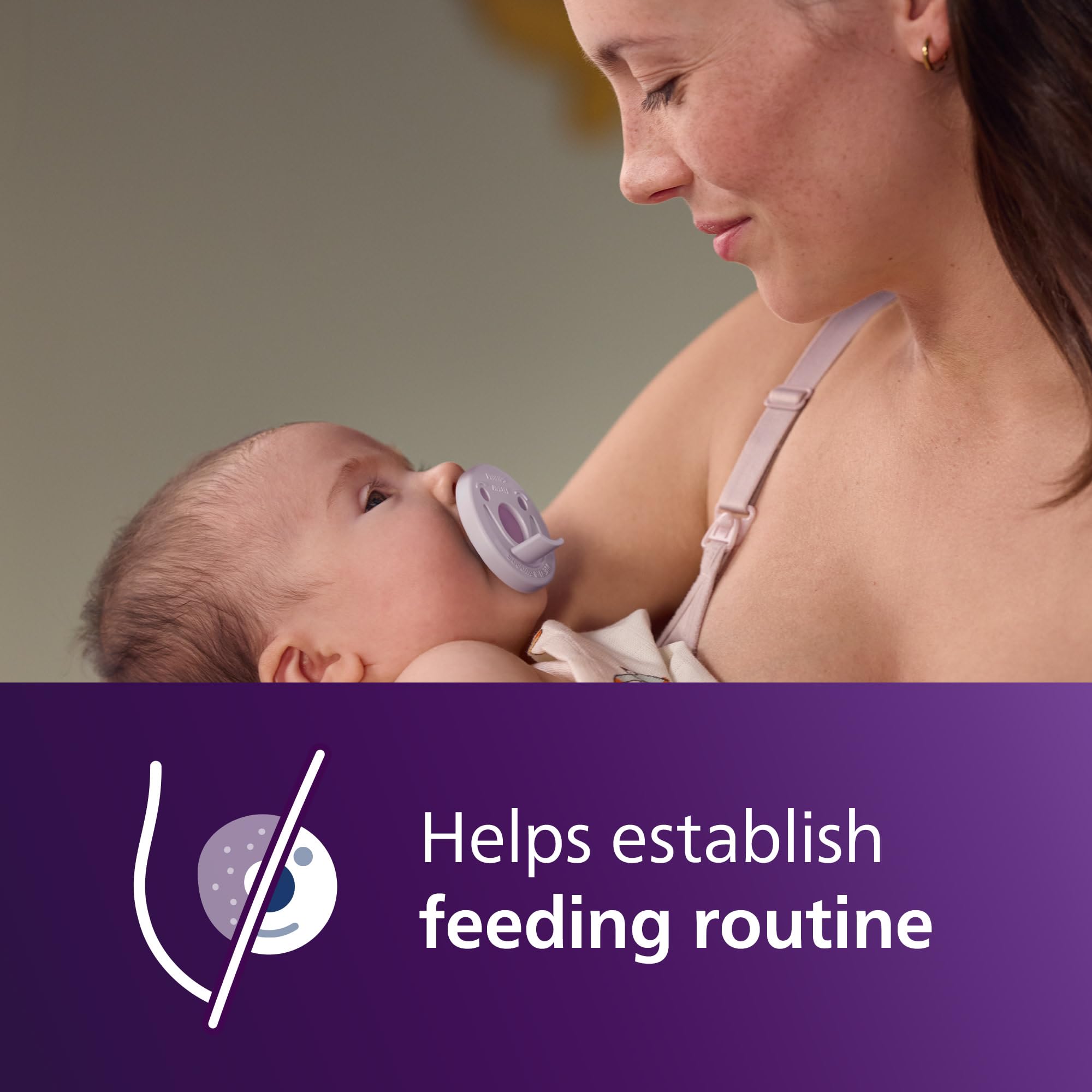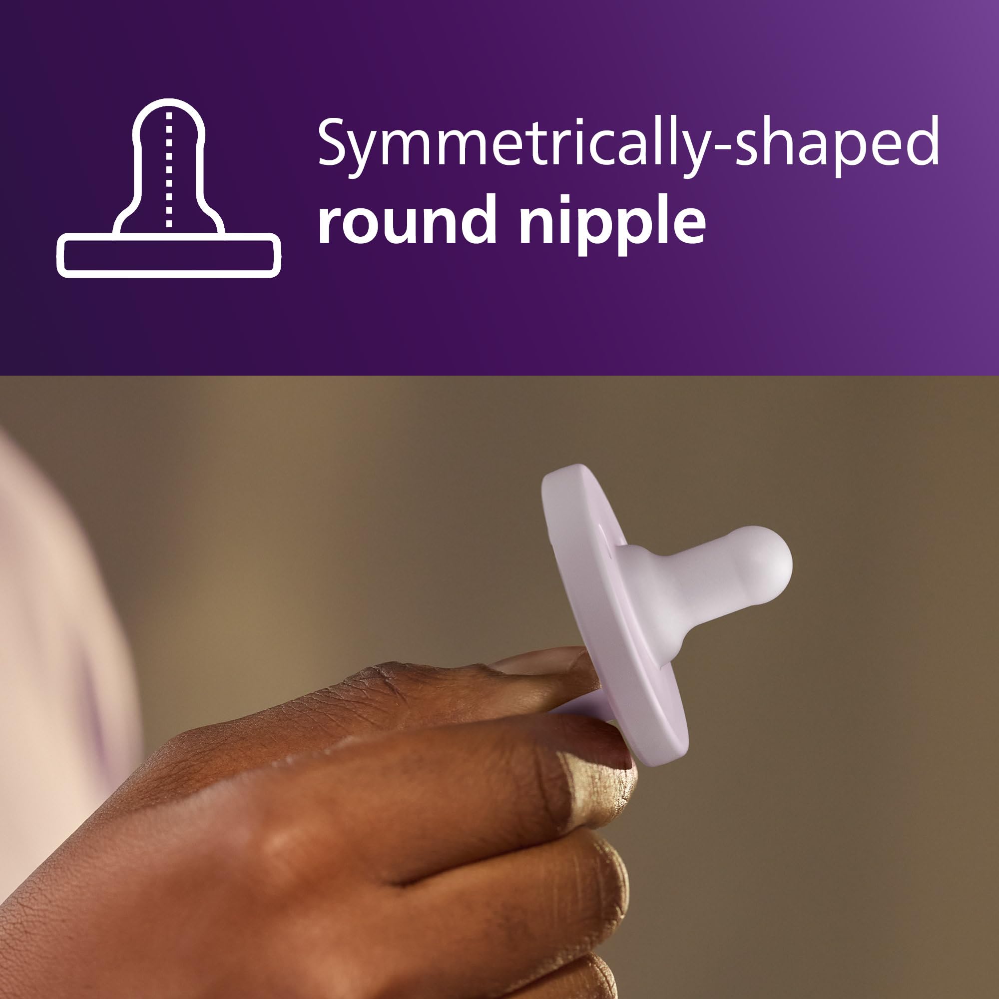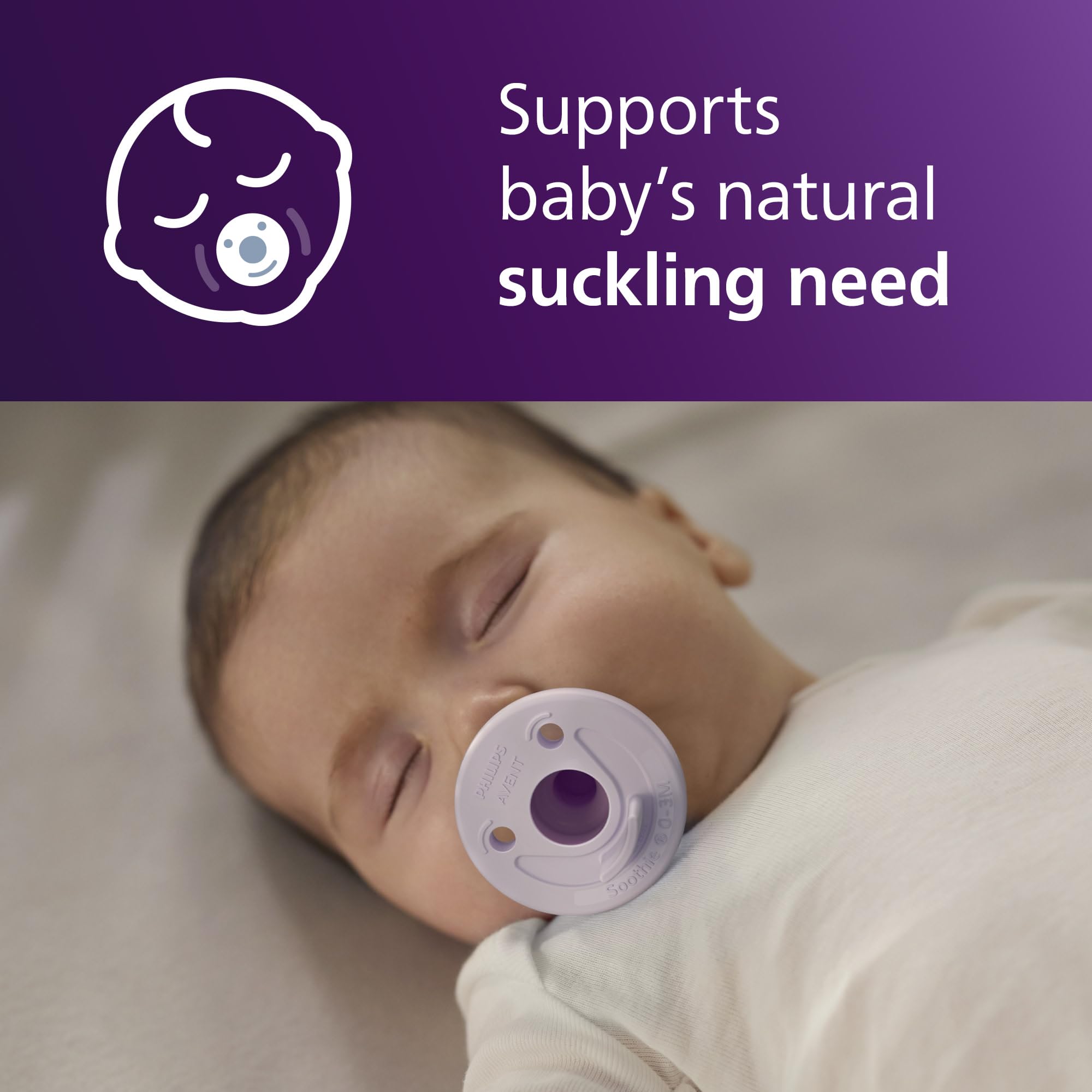 Philips Avent Soothie one-piece newborn pacifiers are specially sized and shaped for babies 0-3 months old and adhere to the American Academy of Pediatrics guidelines¹. The set includes 2 lilac and 2 pink pacifiers. Soothies are made of hospital-grade, BPA-free and latex-free silicone for comfort and durability. A collapsible, symmetrical-shaped nipple supports healthy oral development and promotes your baby's natural suckling instinct. The unique finger-held design lets you place your finger in the nipple so parents and caregivers can bond and connect with the baby, making it easier to share the care. This also makes cleaning easy and prevents water from getting trapped in the nipple. Clean Soothie pacifiers with your sterilizer or submerge them in boiling water. For hygiene reasons, replace soothers after 4 weeks of use. Soothies are compatible with Soothie Snuggle pacifier holders, a soft animal plush toy for babies to hold. The Soothie and plush toy detach so parts can be cleaned separately. Philips Avent Soothie is distributed in hospitals nationwide. 92% of moms trust Soothie for their newborns² ¹ American Academy of Pediatrics recommends to “purchase pacifiers that cannot possibly come apart. Those molded of one solid piece of plastic are particularly safe”. (Caring for Your Baby and Young Child: Birth to Age 5, 7th ed. 2019, By American Academy of Pediatrics, Tanya Remer Altmann and David L. Hill, New York: Bantam Books.) ² of moms aware of Soothie