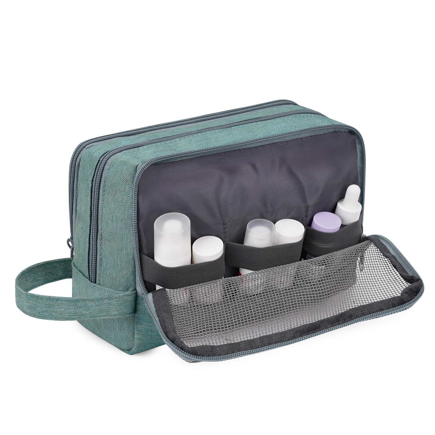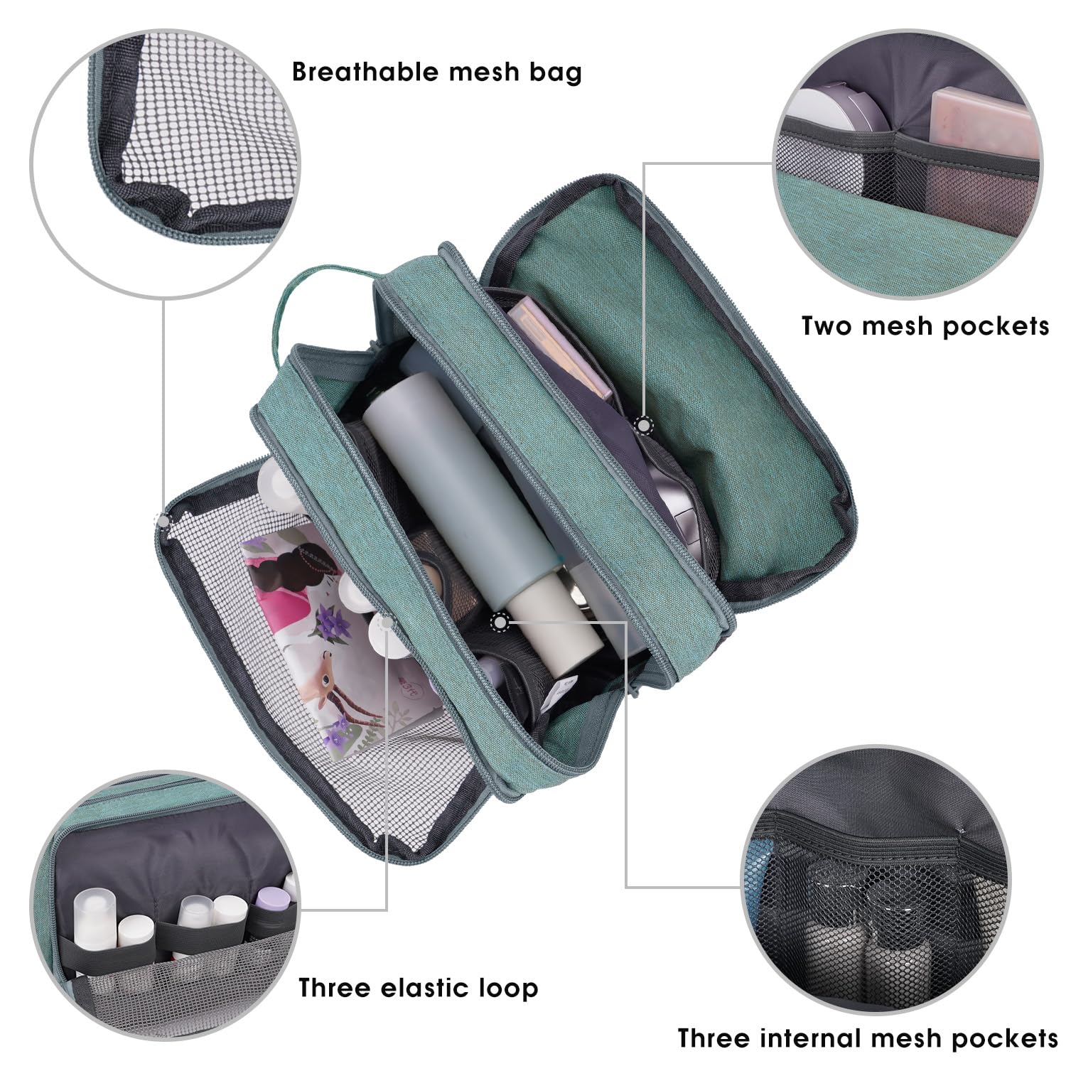 【ORGANIZED COMPARTMENTS】 --- Main compartment that holds larger items such as shampoo bottles or shaving cream. One zippered mesh pouch that keeps your smaller toiletries and cosmetics in a place visible and breathable. Other side front zipper pocket that provides extra storage with easy.