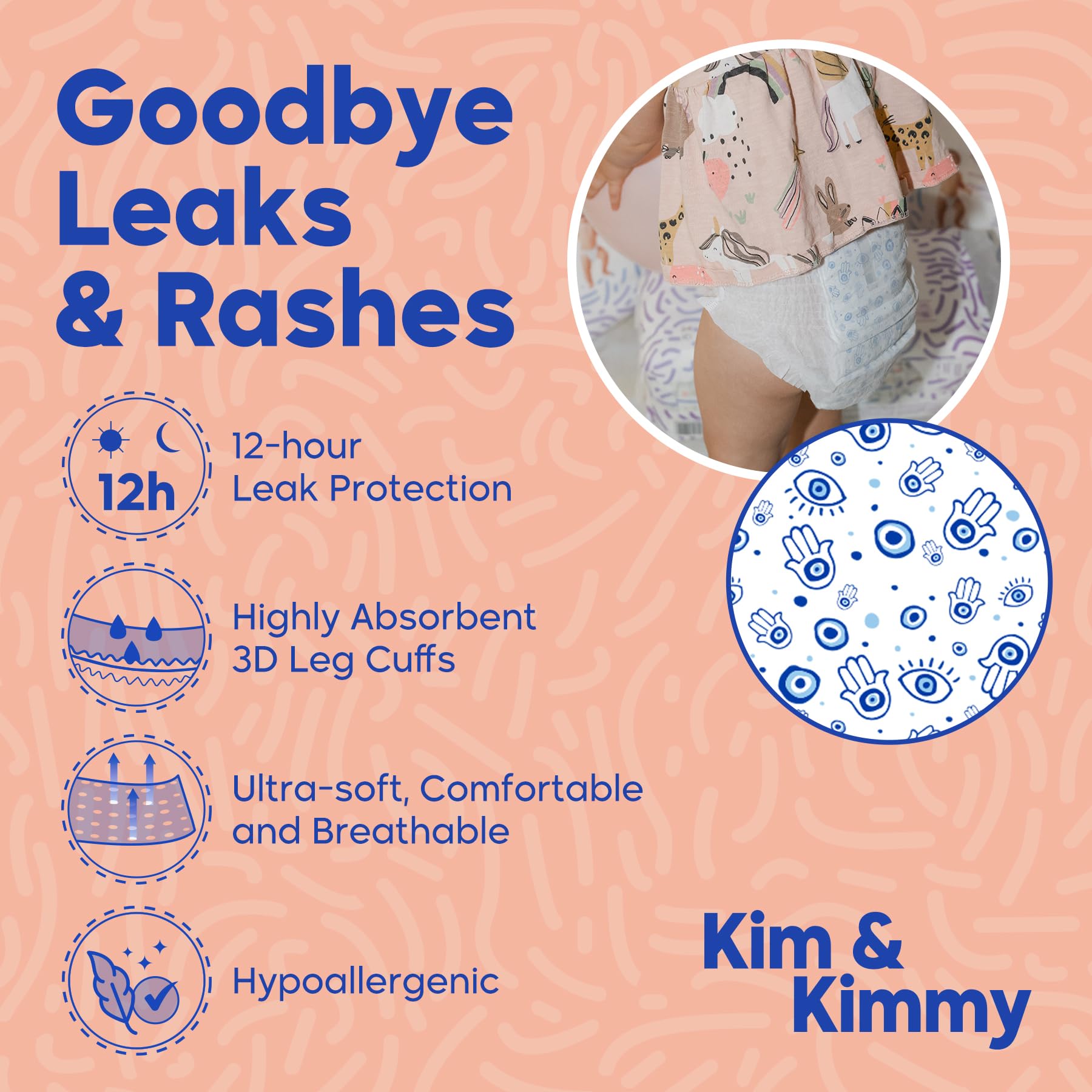 NO LEAKS! 12-HOUR LEAKPROOF PROTECTION - Kim & Kimmy diaper pants guarantee up to 12 hours of leak-free protection. Our 3D magic leg-cuffs ensure maximum absorption with absolutely no leaking, so you and your baby can enjoy a stress-free night.