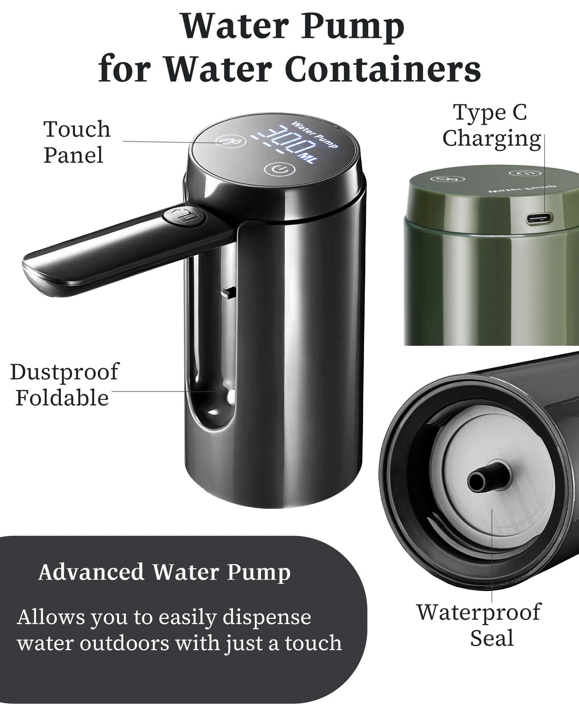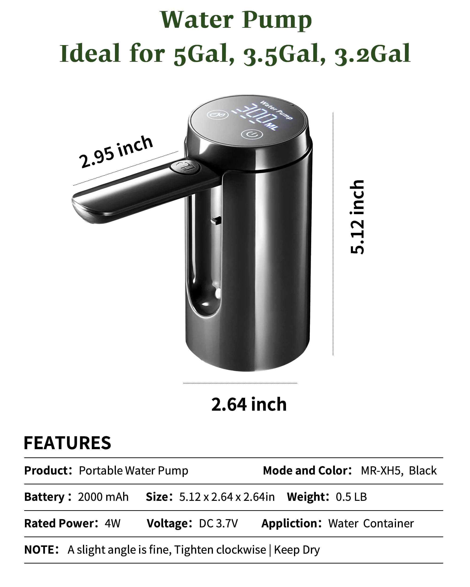 Compatible with Multiple Container Sizes: This pump is suitable for 5-gallon, 4.8-gallon, 3.5-gallon, 3.2-gallon camping water containers, catering to various needs.