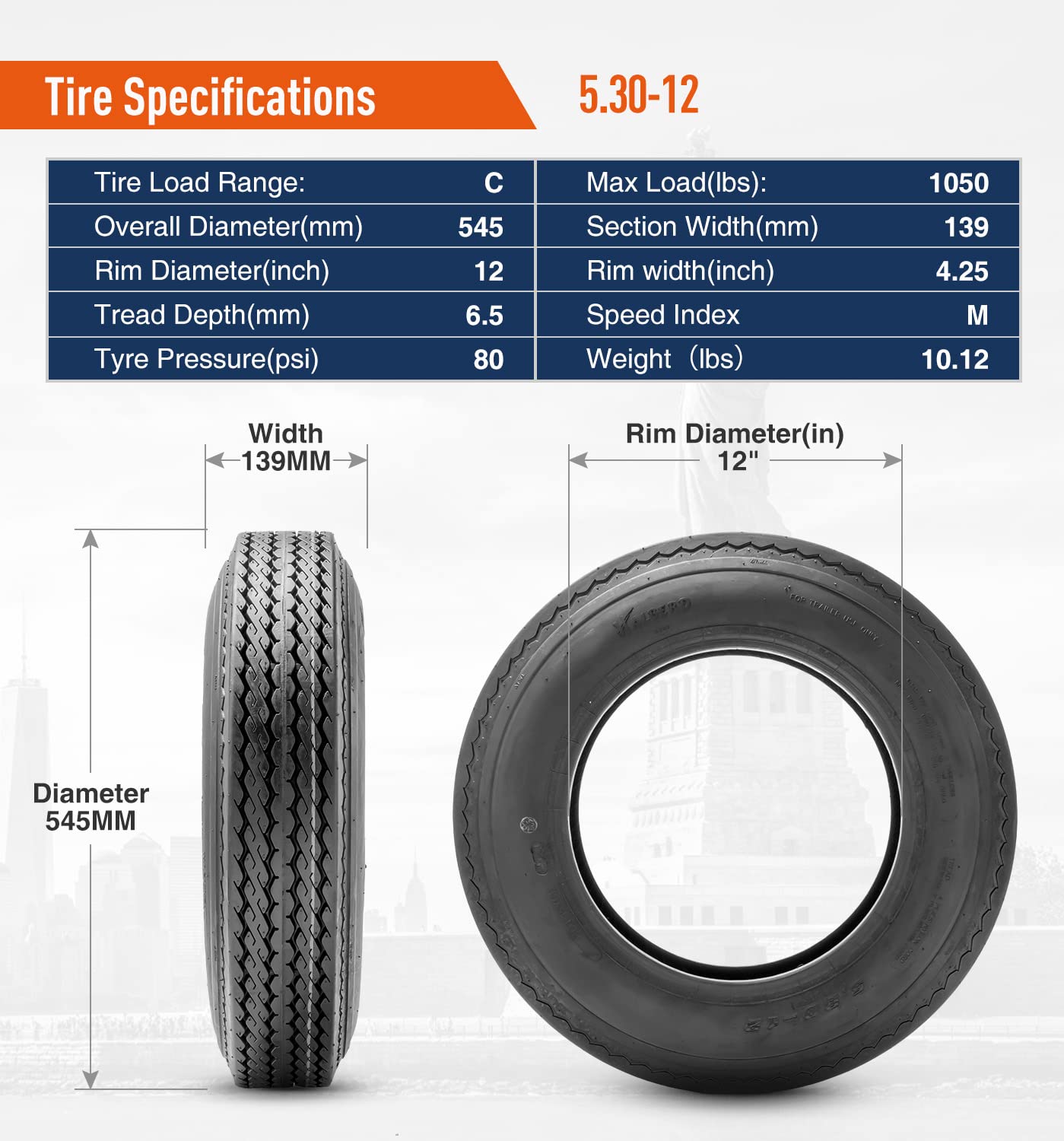 Specification: Tire Load Range: C, Section Width: 139mm, Rim Width: 4.25 in, Overall Diameter: 545 mm, Tread Depth: 6.5mm, Max PSI: 80, Load Index(lbs): 1050, Speed Rating: M