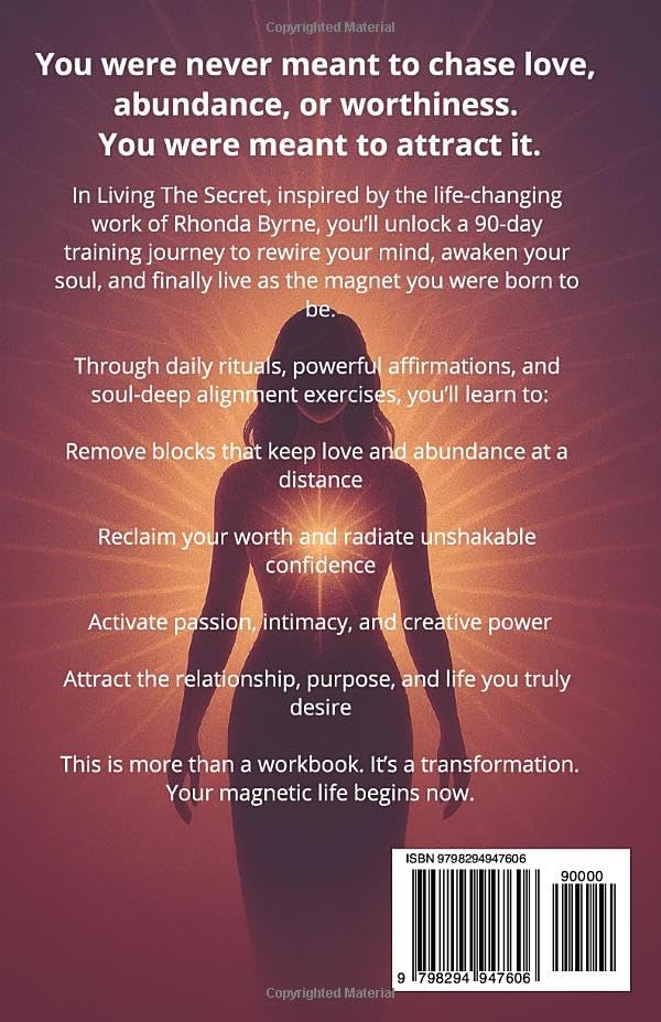 You don’t need to chase love, money, or confidence—you need to become the magnet. Inspired by the transformational wisdom of The Secret by Rhonda Byrne, this groundbreaking 90-day workbook guides you to remove energetic blocks, reclaim your self-worth, and magnetize everything you desire—especially deep love, passionate intimacy, and aligned abundance. Through powerful mind and soul training exercises, you'll learn to: Identify and clear emotional blocks that sabotage relationships Heal fear, unworthiness, and past wounds around love and receiving Awaken your sensual and creative energy to manifest with ease Anchor in confidence, trust, and feminine magnetism Attract soul-aligned love without chasing, begging, or performing Activate overflow in money, purpose, and passion—all at once Whether you’re calling in a soulmate, reigniting passion, or rising into your full radiant power, this guided manifestation workbook will help you fully Live The Secret. ✔ Daily rituals, affirmations, and visualizations ✔ Workbook pages for journaling, tracking, and reflecting ✔ Based on Rhonda Byrne’s most iconic manifestation principles ✔ Rooted in both emotional healing and energetic alignment This is more than a workbook. It’s a transformation. Step into your magnetic self. Love, intimacy, and abundance are already yours.