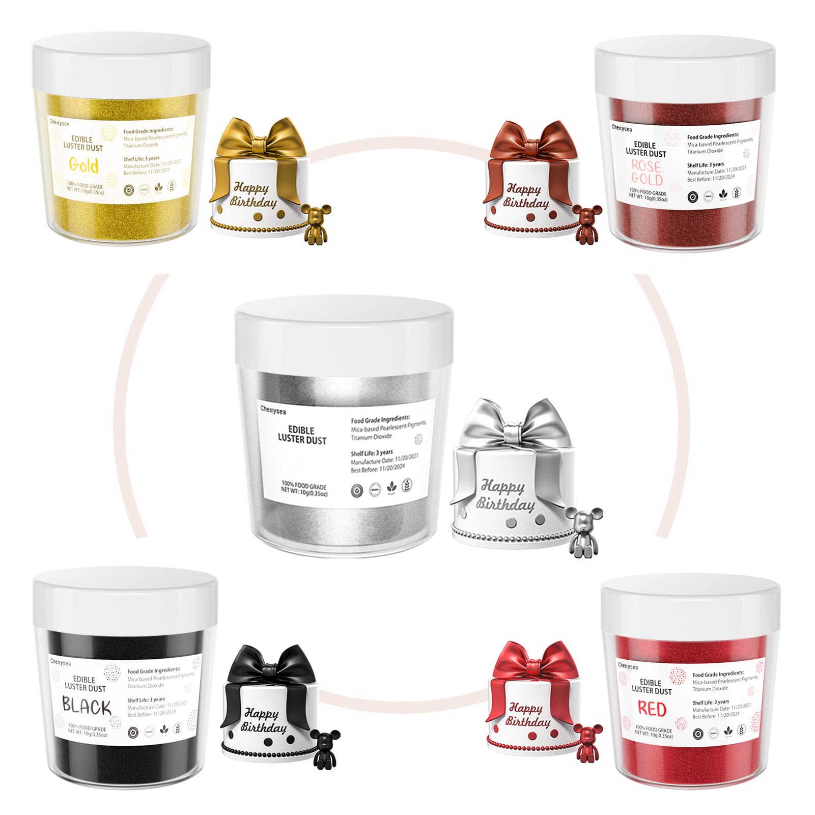 Vibrant Luxury Cake Dust - We offer 11 colors edible dust lust for you to choose:Classic gold and silver, vivid red, vibrant rose gold, and the rare black,pearl white,pink,violet,teal.starryblue,and upgrade rosegold.Each color is unique in its own way, with fine powders and shimmer effects that can add a gorgeous glow to your favorite foods