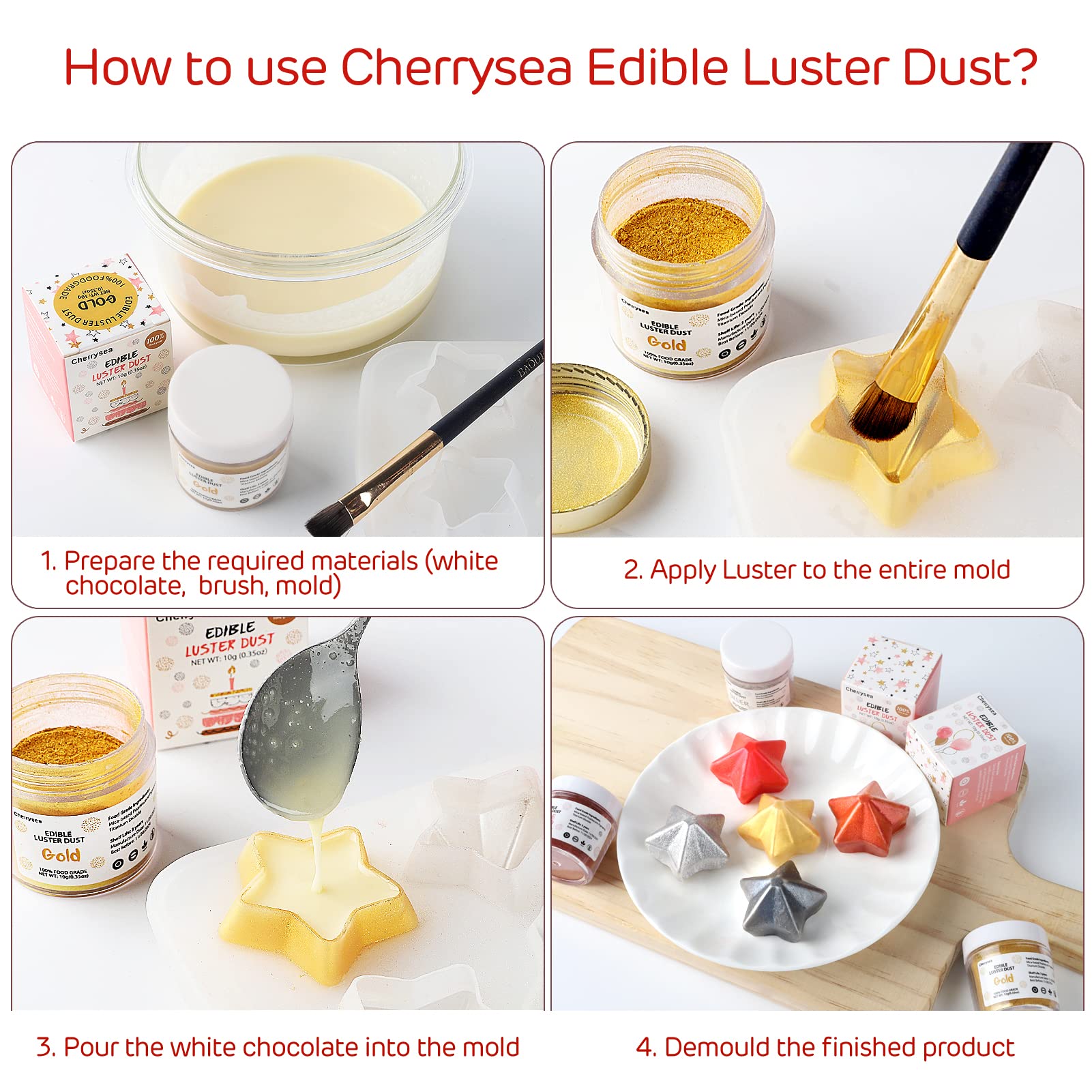 Food Safe & Flavorless - This cake edible luster dust adopt advanced imported material includes Mica powder and Titanium Dioxide. Approved by MSDS,tasteless and odorless, won't change the flavor or texture of your food.Gluten-free, dairy-free. Vegetarians can also use with confidence
