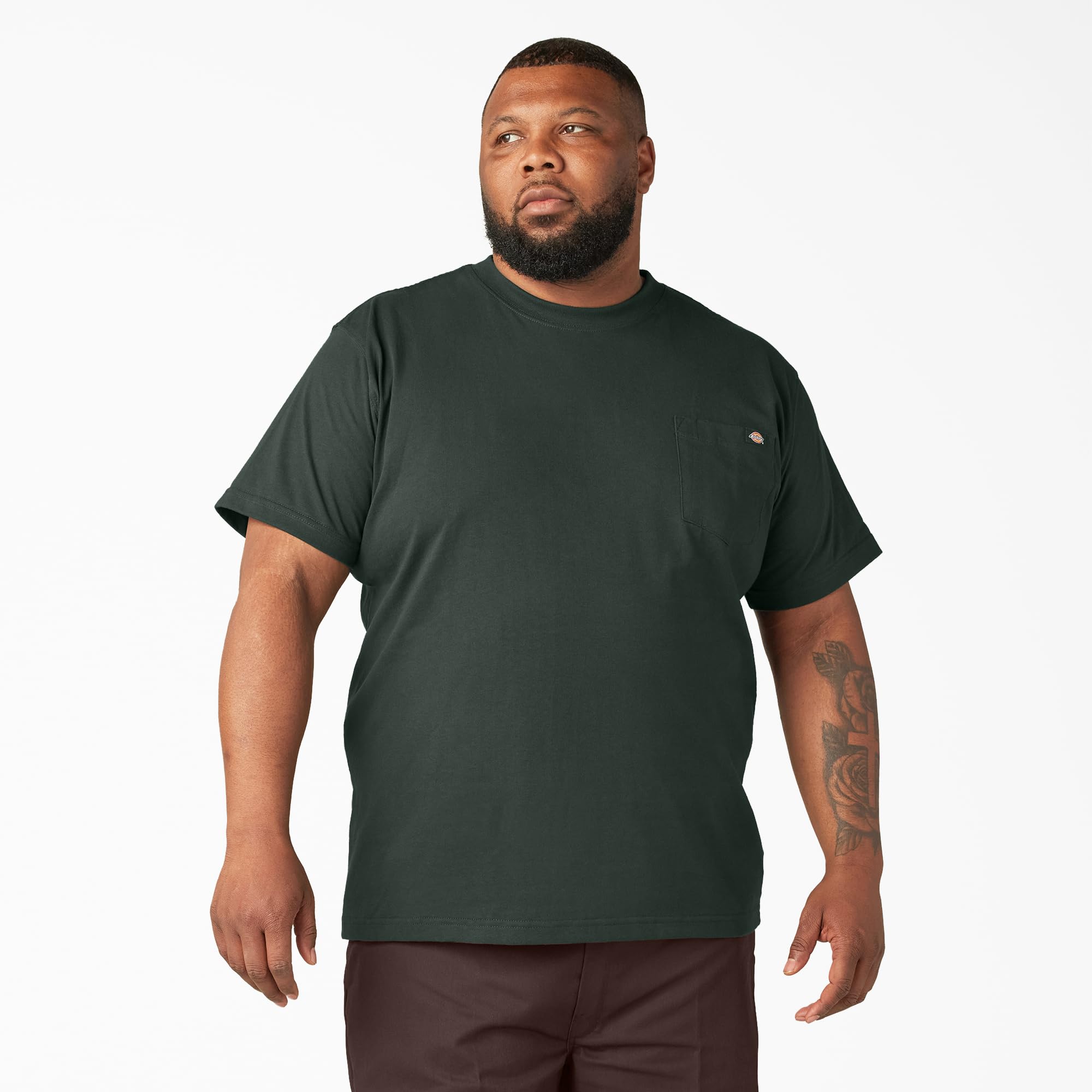 Description Hard-working men everywhere will be comfortable in the Dickies' Short sleeve heavyweight crew neck t-shirt. Made of a jersey knit material, this heavyweight cotton blend is durable, and designed with cotton comfort. On top of the fabric durability, The taped neck and shoulder seams up the ante on strength for longer wear.