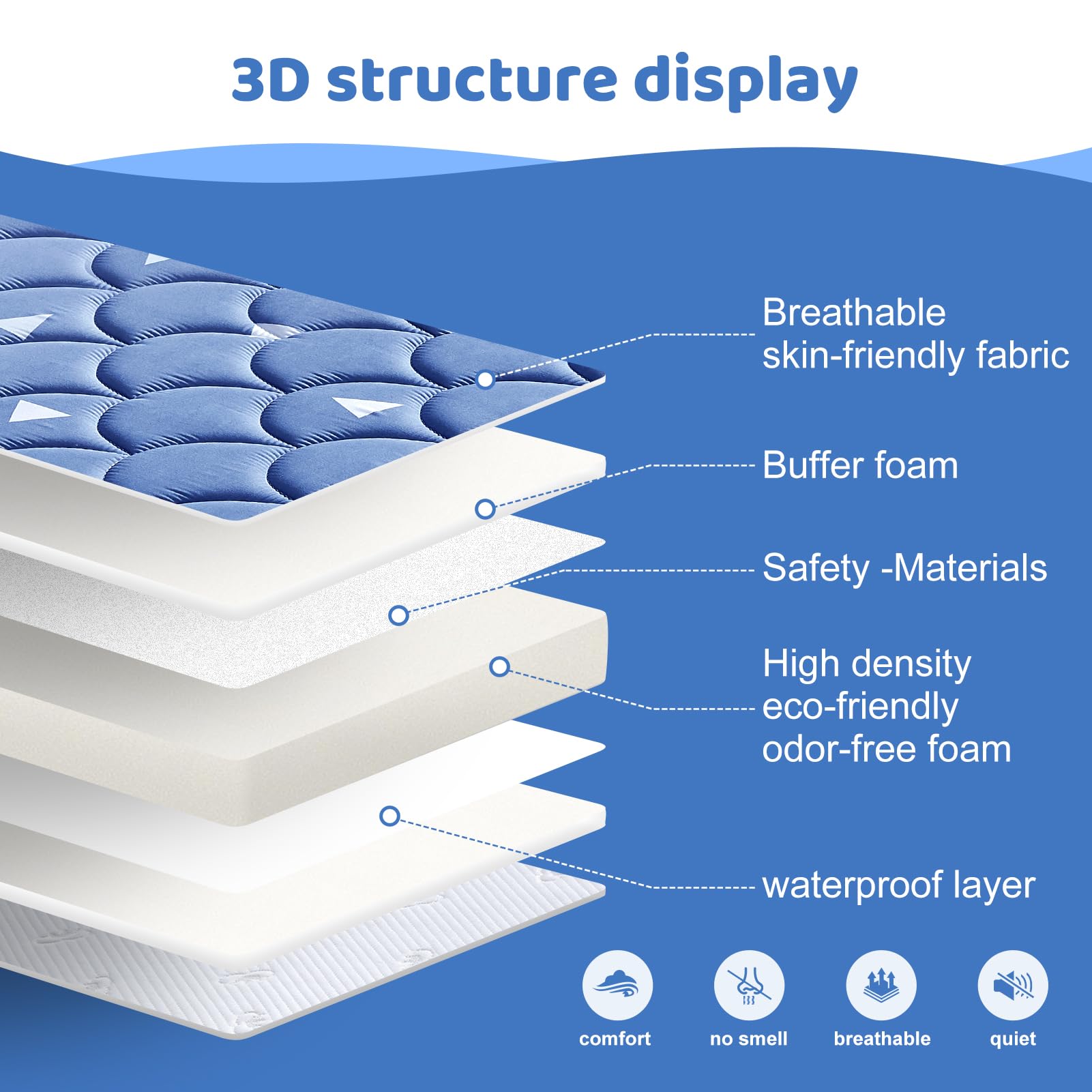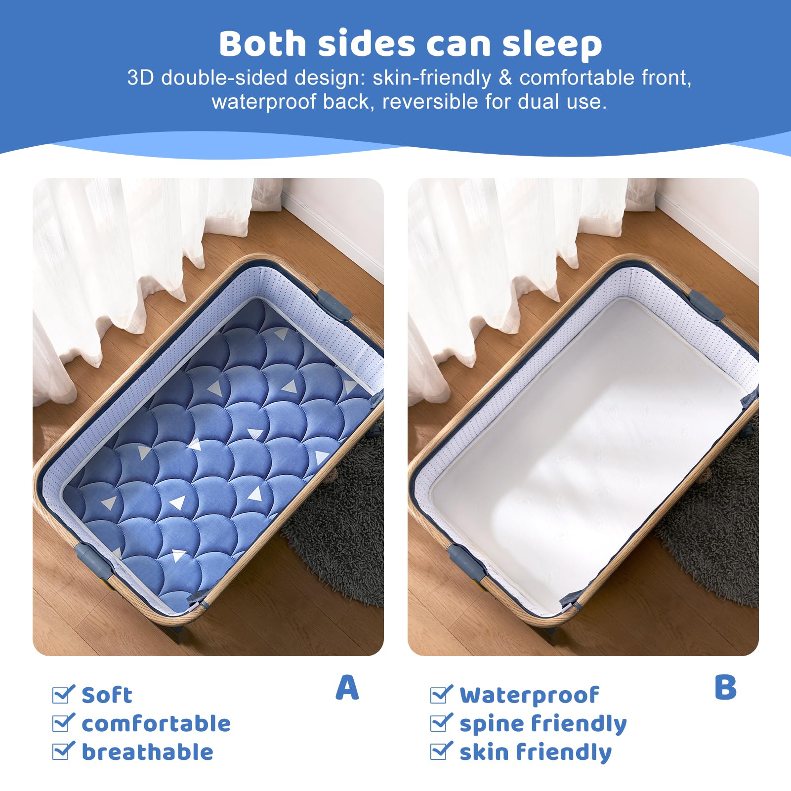 Handmade edges: Using handmade 3D edges and rounded corners design, it fits snugly with the cradle, preventing babies from getting their feet caught and toys from falling off, making the mattress better cushioned, not deformed, and improving comfort.