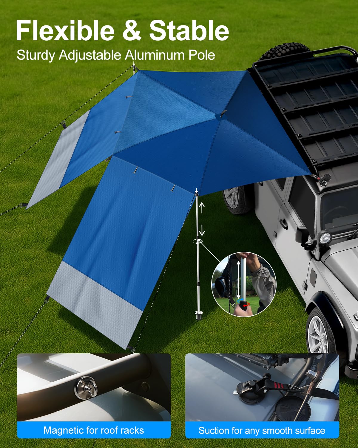 Flex Meets Fortress: Tired of one-size-fits-all? Our sturdy aluminum poles adjust from 35.43" to 90.55" to fit most vehicles—whether it’s a car, SUV, truck, or RV. Suction cups or magnetic hooks—you choose. One awning, endless possibilities.