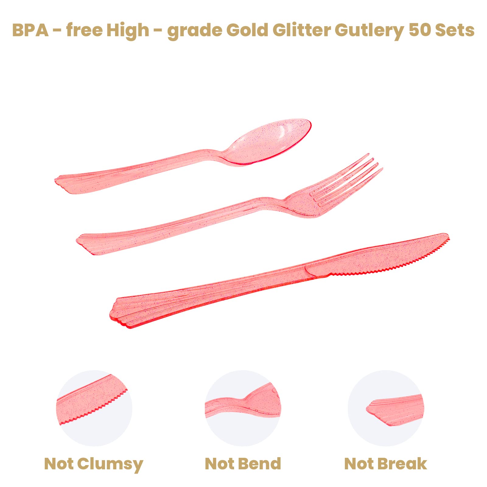 ✔「Sever for 50 Guests」 This party dinnerware set including 9" dinner paper plates *50, 7" paper dessert plates *50, 9oz paper cups *50 and luncheon napkins (3-ply, 6.5" x 6.5") *50, 50 sets of heavy duty gold plastic cutlery (50 forks, 50 spoons, 50 knives)