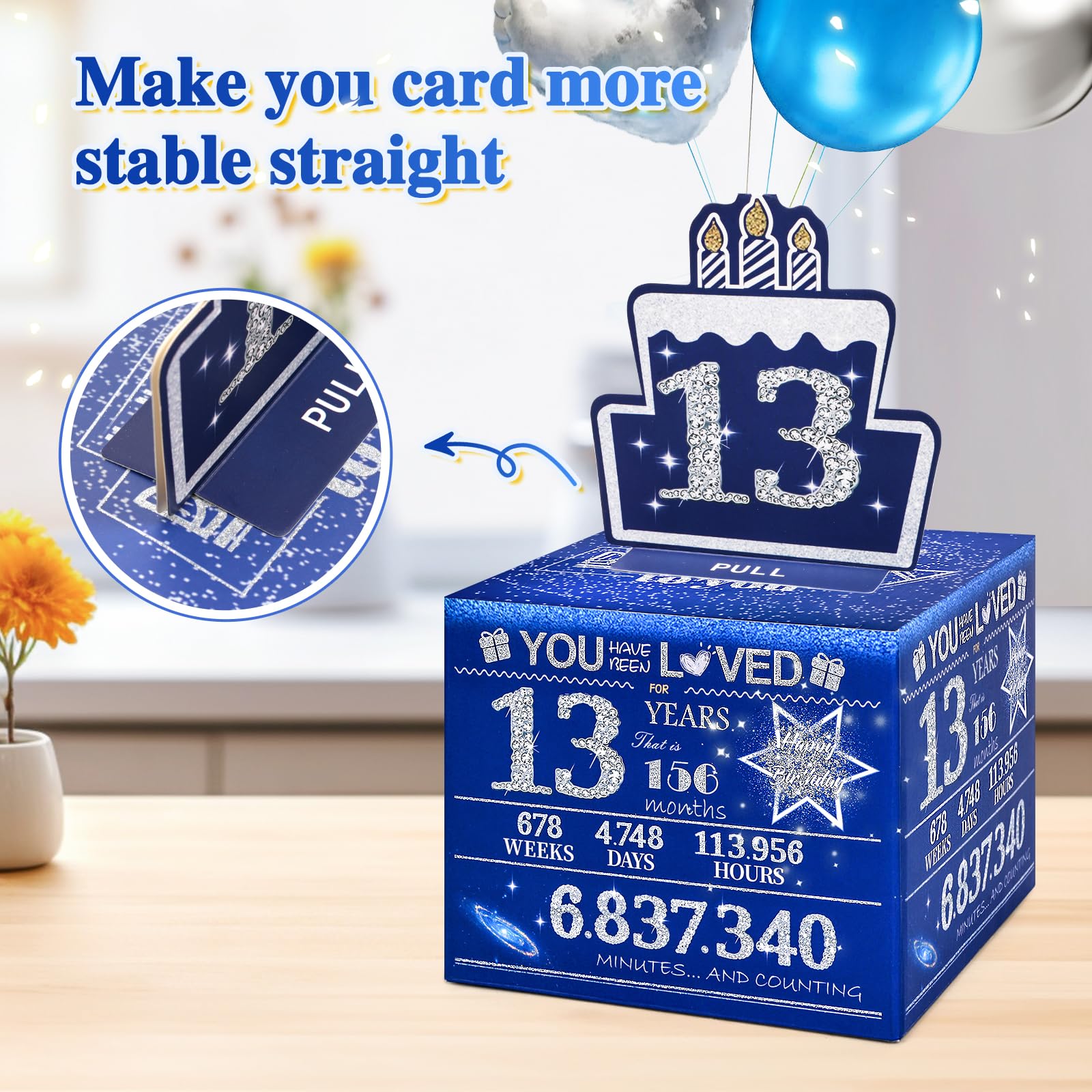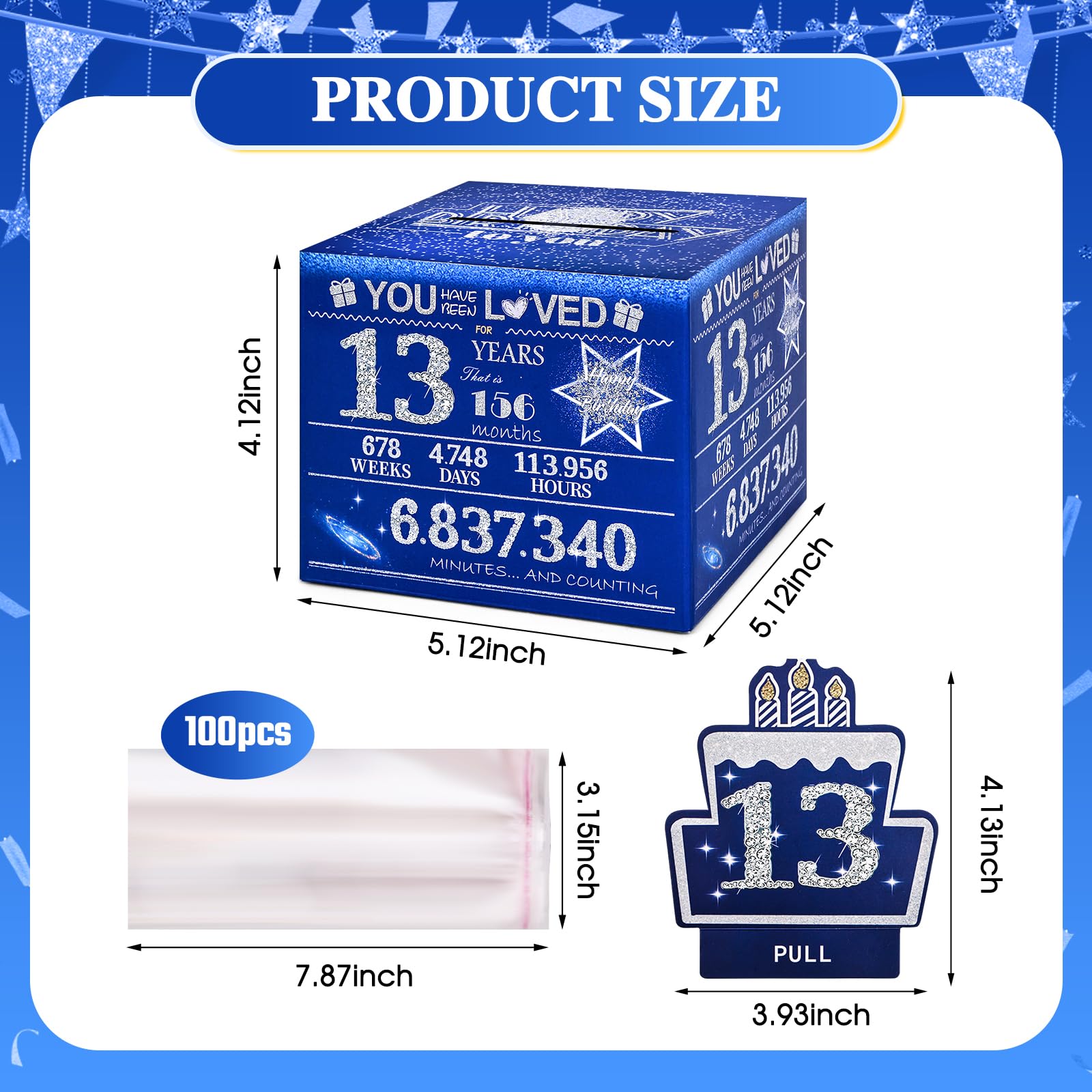 13 Year Old Boy Birthday Decorations : This items measures 4.12 x 5.12 x 5.12 inches and is made of thick cardboard, making it sturdy and durable. It also includes one birthday cake card (with adhesive dots in the middle) that can stand top on the birthday money box. The product has upgraded the quantity of plastic bags, similar in size to a dollar bill, to 100, satisfying your DIY needs.